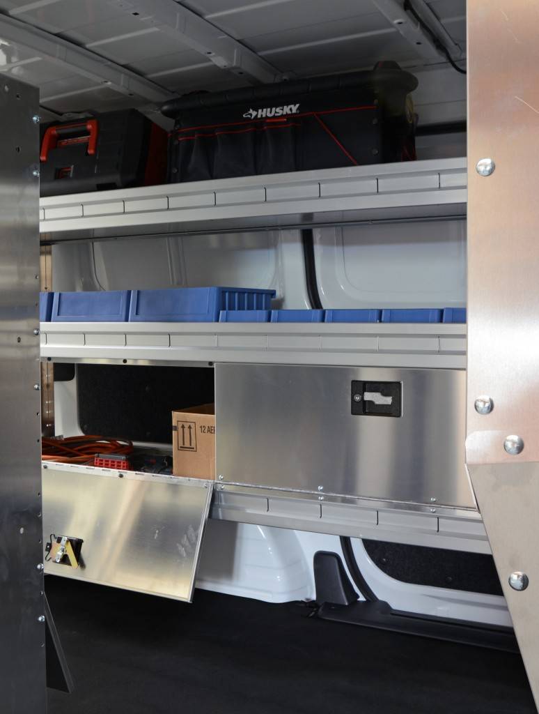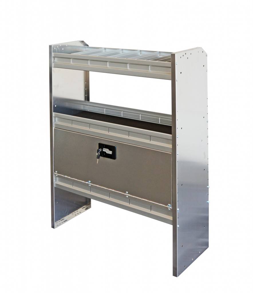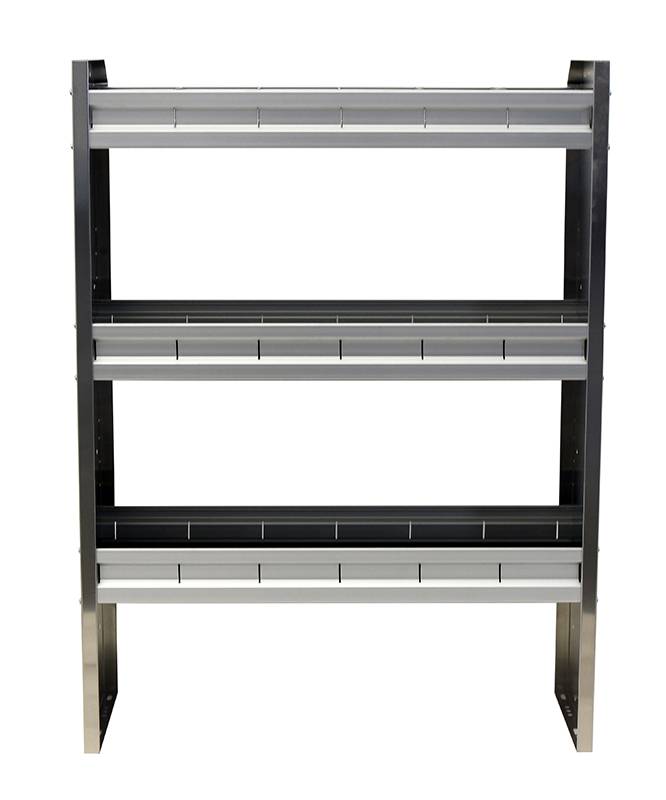 Aluminum Shelf dimension 32" W x 43"H x 12"D with installation brackets and fasteners weights ONLY 30 LBS. New aluminum partition has top half perforated for driver visibility. Embossed for extra strength and to reduce noise. Includes no-drill mounting kits for all compact vans. Available accessories include shelf dividers, lockable door kits, and stackable plastic bins (10"W x 5.5"H x 11"D and 5"W x 3.5H x 11"D).