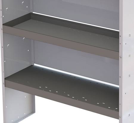 The Kargo Master Shelving System is one of the most durable and flexible shelving systems available on the market. All Kargo Master Shelving units are built with a unique lance support technique, which provides additional shelf-to-structure support on each shelf layer. Each van shelf is constructed with powder coated heavy duty steel that provides protection against abrasive use. The individual shelves of each Kargo Master Shelving unit can be adjusted to differing heights depending on each unique shelving need. Van shelves are also contoured with the frame to enable the unit to fit flush against your van walls; maximizing space. Steel backings are included with these shelves and reversible front lip stoppers are on each individual shelf to prevent sliding forward of stored equipment during transport. Additional Kargo Master shelving accessories are available to customize your Van Storage Needs!