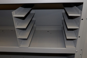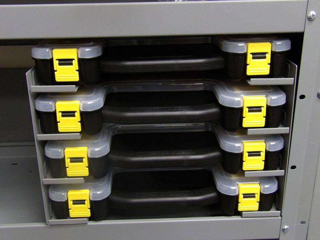 Need more storage space for your loose and small items? These durable plastic totes fit securely on all Kargo Master Shelving Units in a steel 4 tote shelf cabinet to create additional organized storage spaces that would've otherwise been wasted. These plastic totes are custom fitted to stay securely in place to prevent any displacement even on a bumpy road. If you have a 42" shelving unit, with a drawer cabinet and considering using totes, you may want to consider adding this tote shelf cabinet to have extra storage space.