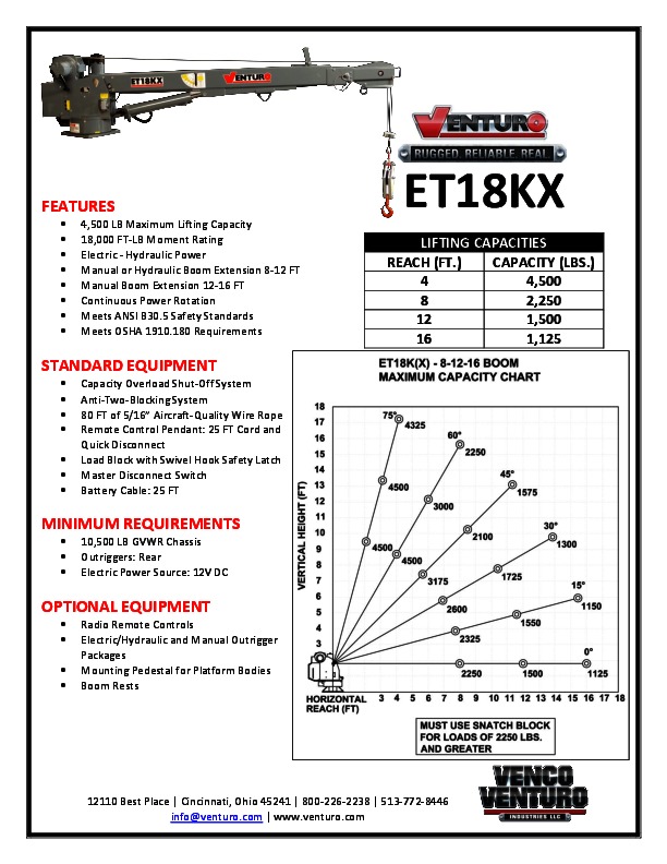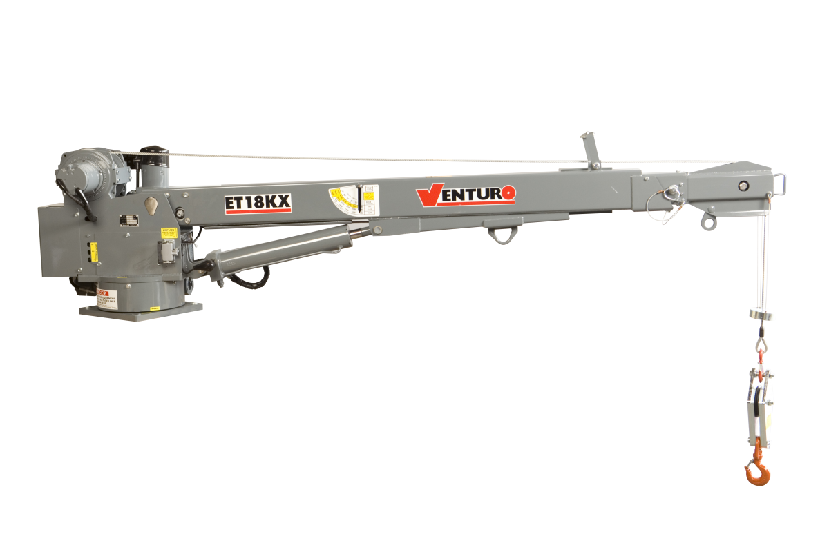 The Venturo ET18KX is a 18,000 ft.-lbs. crane with 4,500 lb. lifting capacity. Features electric winch, elevation, rotation and extension.
