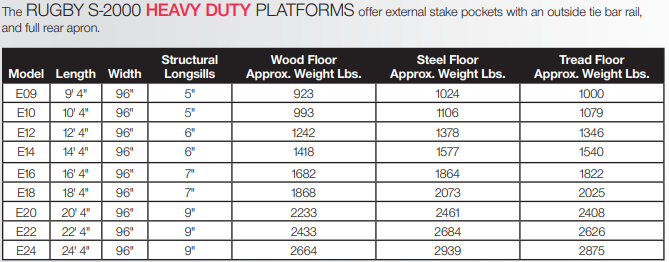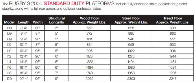 Rugby's Series 2000 Platform Bodies are built to exceed your highest expectations at a price that makes your decision easy. Available in 3 styles: standard duty with internal stake pockets, heavy duty with external stake pockets and tie down rails, and super heavy duty with a frame made almost entirely of structural channel.