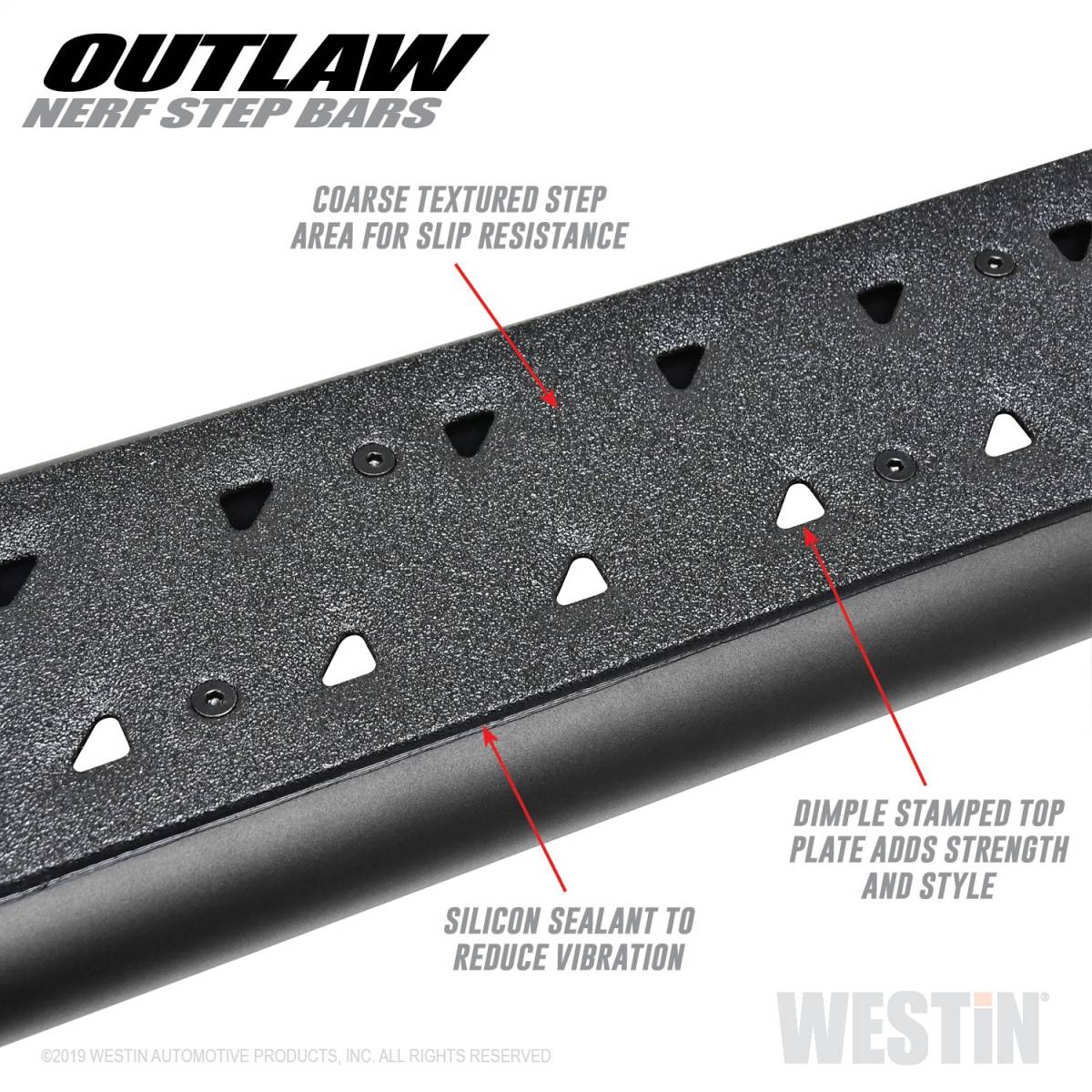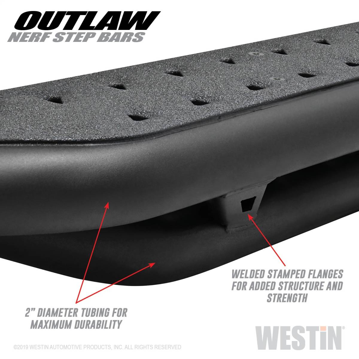 Westins Outlaw Nerf Step Bars offer the perfect balance between function and strength resulting in the ultimate rugged look designed to last and impress. Engineered to fit tightly against rocker panels, the Outlaw Nerf Step Bars provide a solid fit and superb protection while simultaneously improving vehicle cab access. Whether you are an avid overlander or simply an off-roader, rest assured you will be safely stepping into your vehicle with a 16 gauge steel coarse step surface and 2" diameter tubing. Featuring bolt-on installation, an e-coated base coat and textured black powder coat top finish, Westins Outlaw Nerf Step Bars are the ideal match for the toughest of conditions.