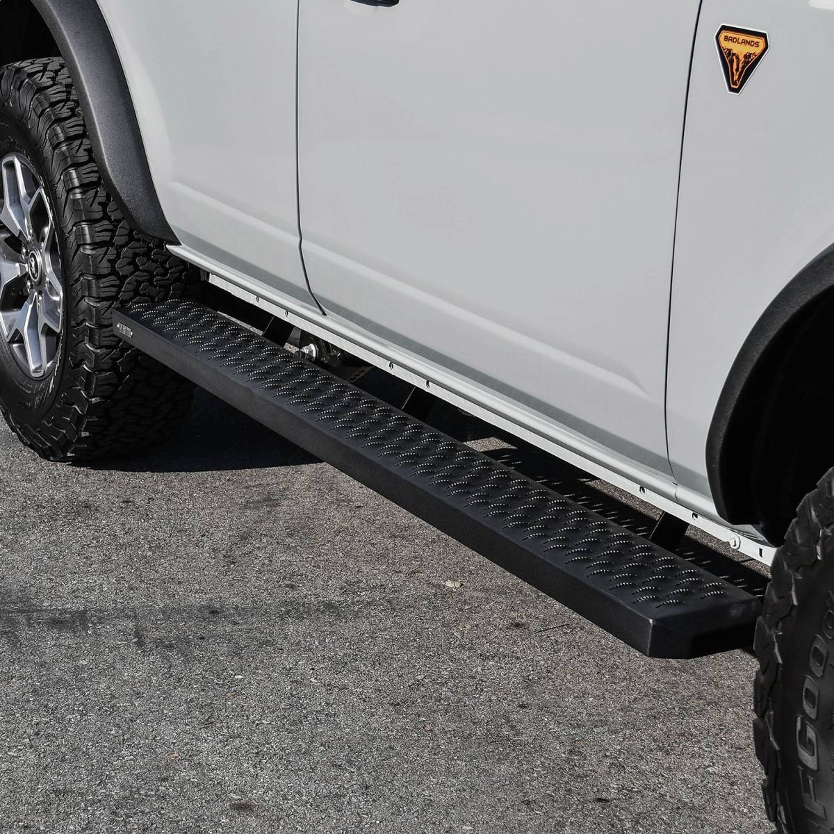 Vehicle Specific Mount Kit Required/Sold Separately; Ends Are Stylishly Formed And Fully Welded; Ideal For Construction/Commercial/Vans/Utility Use; Available In Universal Lengths; Solid 1-Piece Construction; Engineered To Provide Maximum Traction Without Sacrificing Style; Serrated Edges Help Clean Snow/Mud Off Boots To Keep Cab Clean; Aggressive 1/4 in. High Punched Tread For Traction In Any Weather; E Coated Base Coat Provides Long Lasting Corrosion Protection; 6 1/4 in. Step Surface Width; Custom Die Cast Riveted Logo Badge