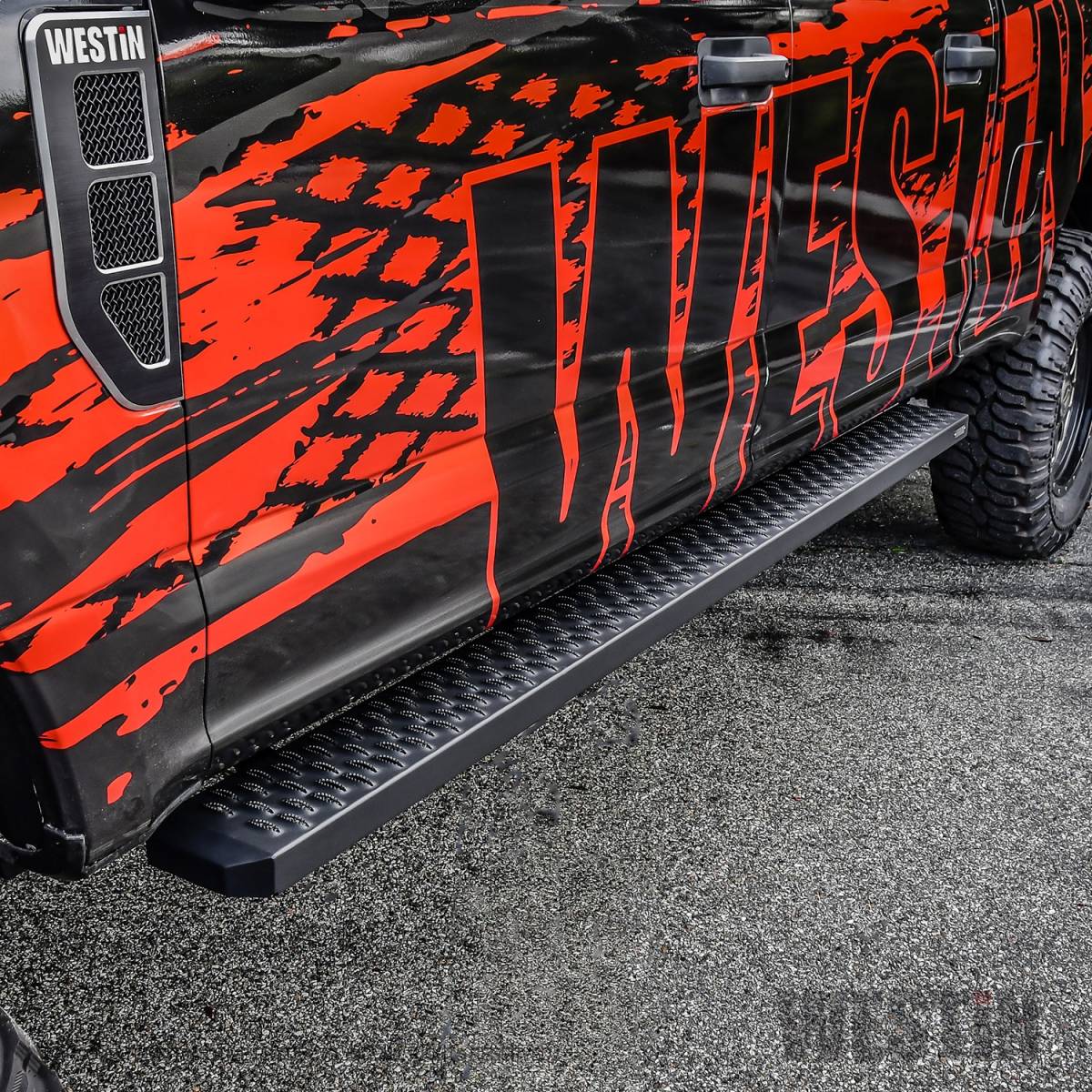 Westins Grate Steps Running Boards are engineered to provide maximum traction without sacrificing style. The 6 1/4" step surface width features an aggressive 1/4" high punched tread allowing traction in any weather condition. The unique serrated edges help clean dirt, snow and mud off your boots to keep truck cab clean. Grate Steps Running Boards feature stylishly formed and fully welded ends with a custom die-cast riveted logo badge. E-coated base coat provides long lasting corrosion protection which far surpasses that of the competition. Solid 1-piece construction makes the Grate Steps Running Boards ideal for construction, commercial, vans and utility use. Available in universal lengths (54", 68", 75", 79", 83", 86" and 90") with vehicle specific mount kit required, sold separately. Available in textured black finish.