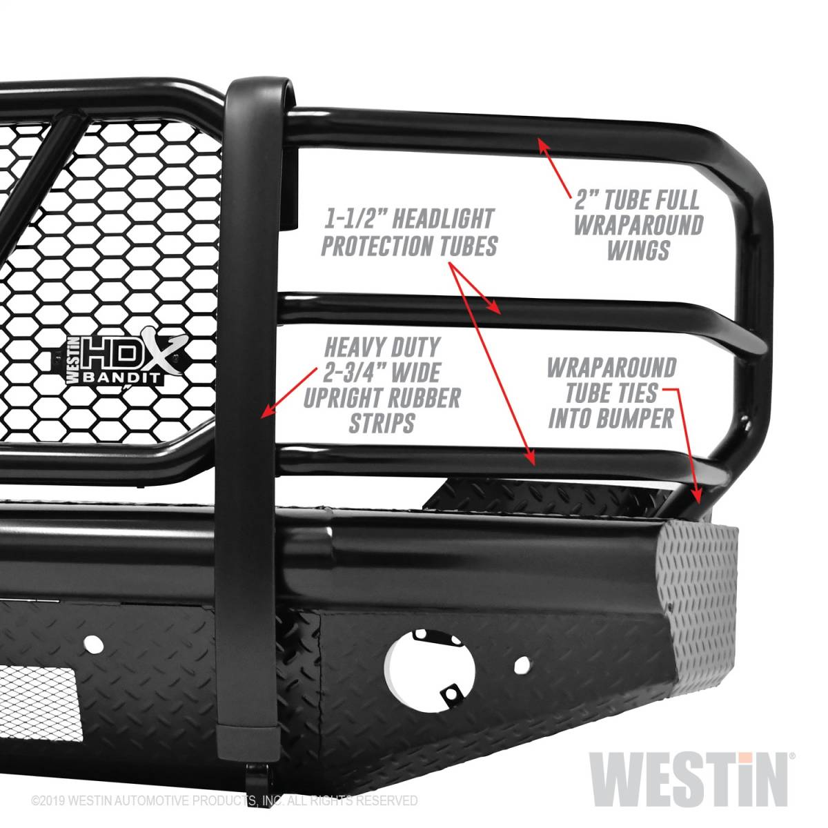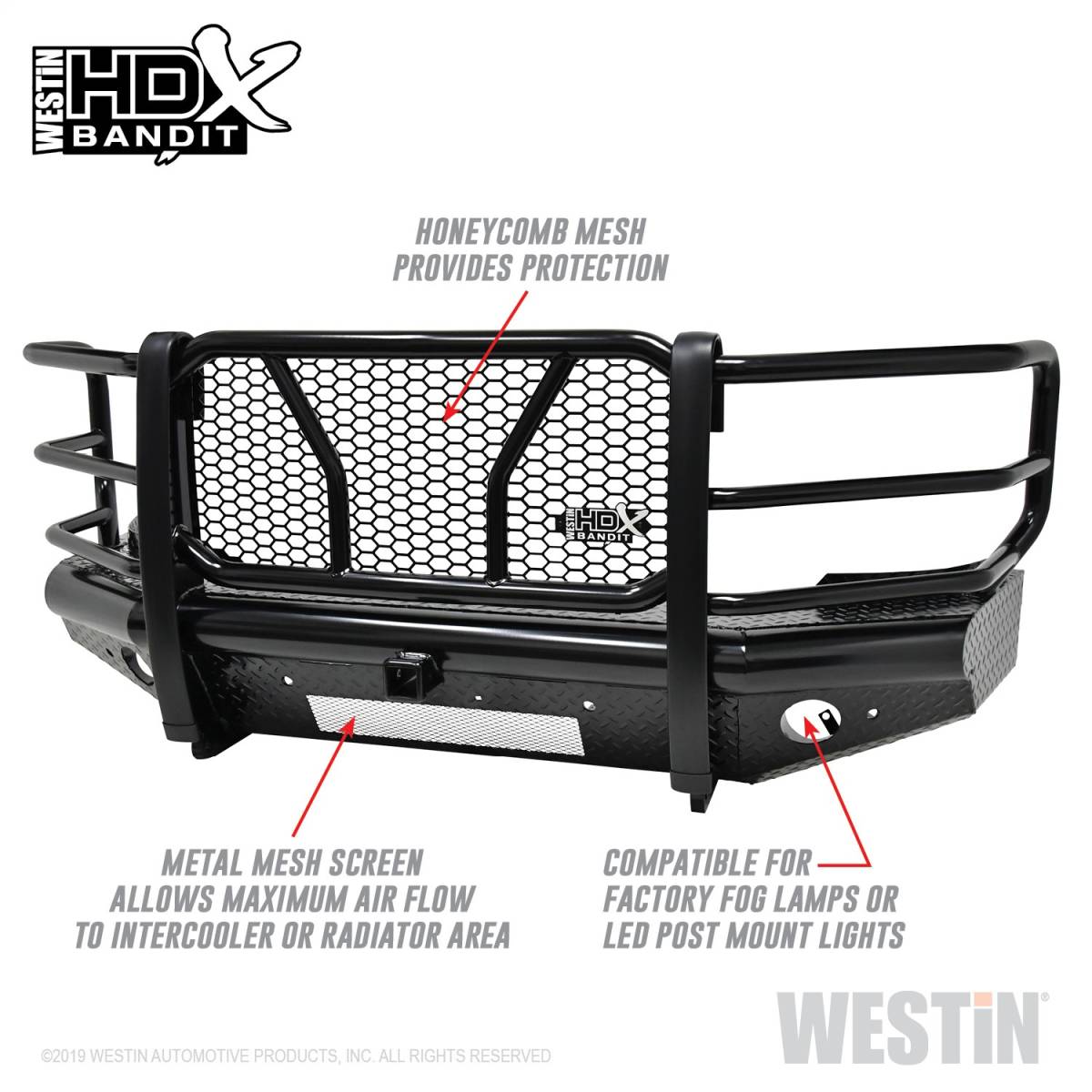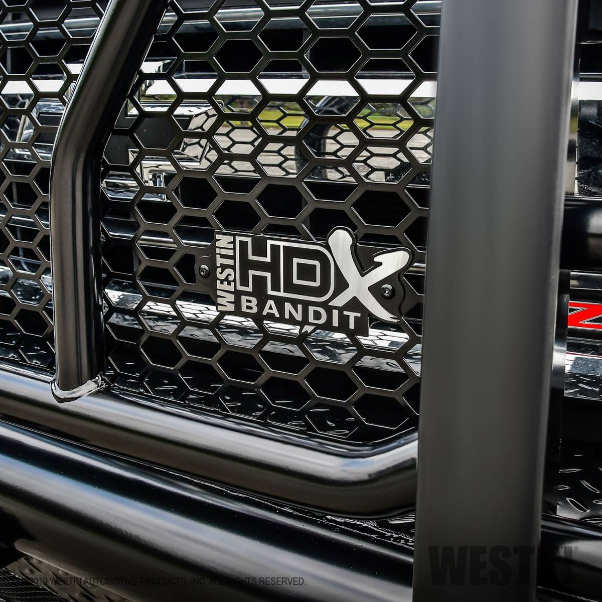 Westins HDX Bandit Bumper combines a heavy duty diamond plate steel bumper constructed of schedule 40 steel pipe with a stylish grille guard featuring 2" diameter outer wraparound wings and 2 3/4" wide upright rubber strips. Designed to protect headlights, grille, hood and front fenders from road hazards, debris and wildlife damage. Features a stylish metal honeycomb mesh screen, which allows maximum airflow to the intercooler or radiator area while accenting the front end styling with a clean and rugged look. Removable mesh screens allow for factory camera and adaptive cruise control options available on some late model Ford applications. HDX Bandit Bumper includes a built-in 2" receiver hitch and (2) heavy duty 9,500 lbs bow shackle mounts, capable of delivering multiple towing options. Compatible for factory fog lamps or LED post mount lights. In addition, some late model Ram and Chevrolet applications feature provisions for factory parking sensors. Bolt-on installation with hardware and mounting brackets included. Available in black powder coat finish.