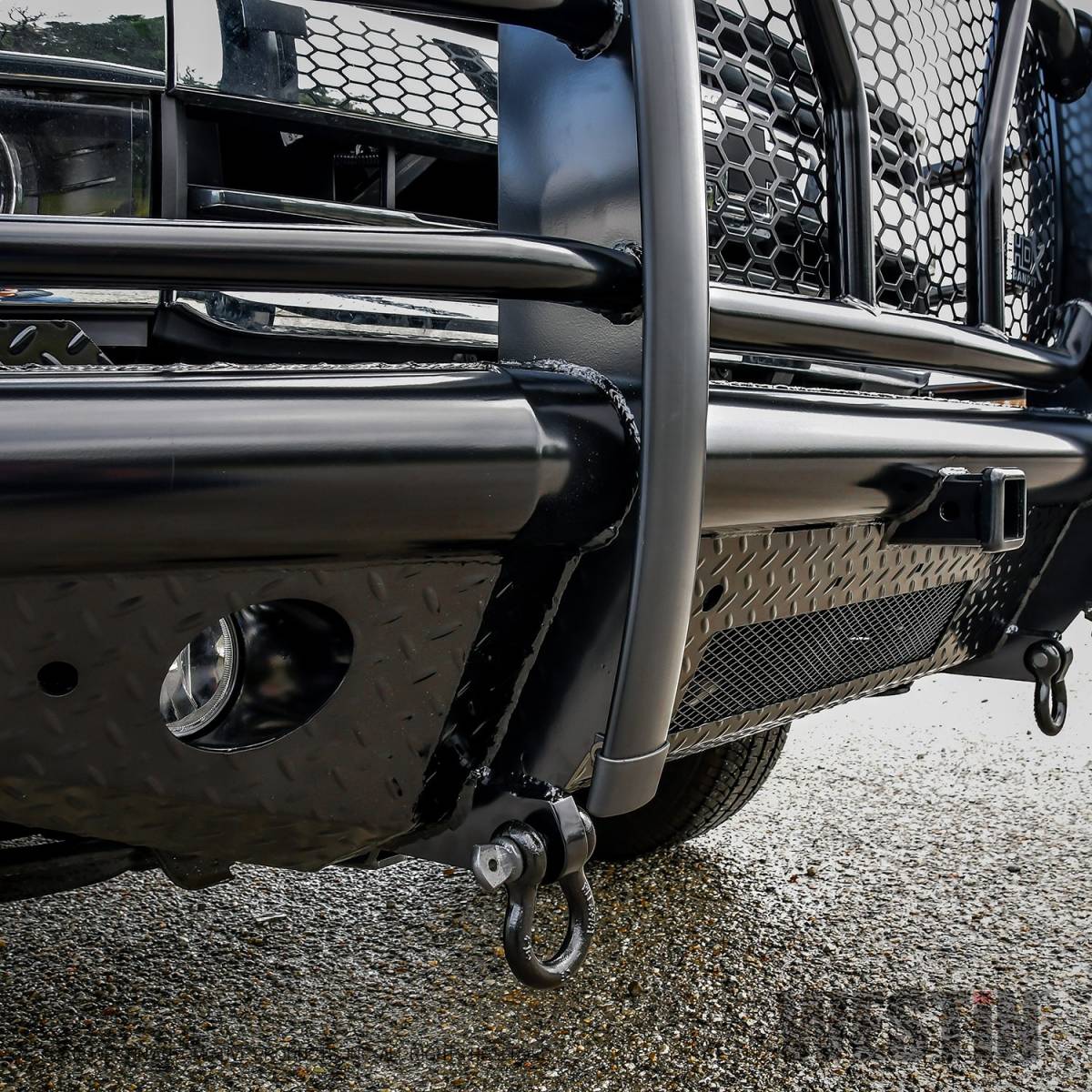 Protects Vehicle From Damage Against Wildlife And Road Debris; Custom Die Cast Riveted Logo Badge; Mounting Provisions For License Plate; Hardware Mounting Brackets Included; Provides Added Safety To Driver And Vehicle; Heavy Duty Diamond Plate Steel; Honeycomb Mesh Protects Grille/Gives Maximum Airflow; 1.5 in. Headlight Protection Tubes; 2 in. Full Wraparound Wings Ties Into Bumper; Provisions For Factory Parking Sensors; 2 in. Receiver Hitch/Heavy Duty 9500 lbs. Bow Shackle Mounts; Compatible For Factory Fog Lamps Or LED Post Mount Lights