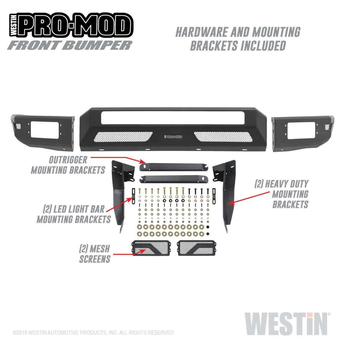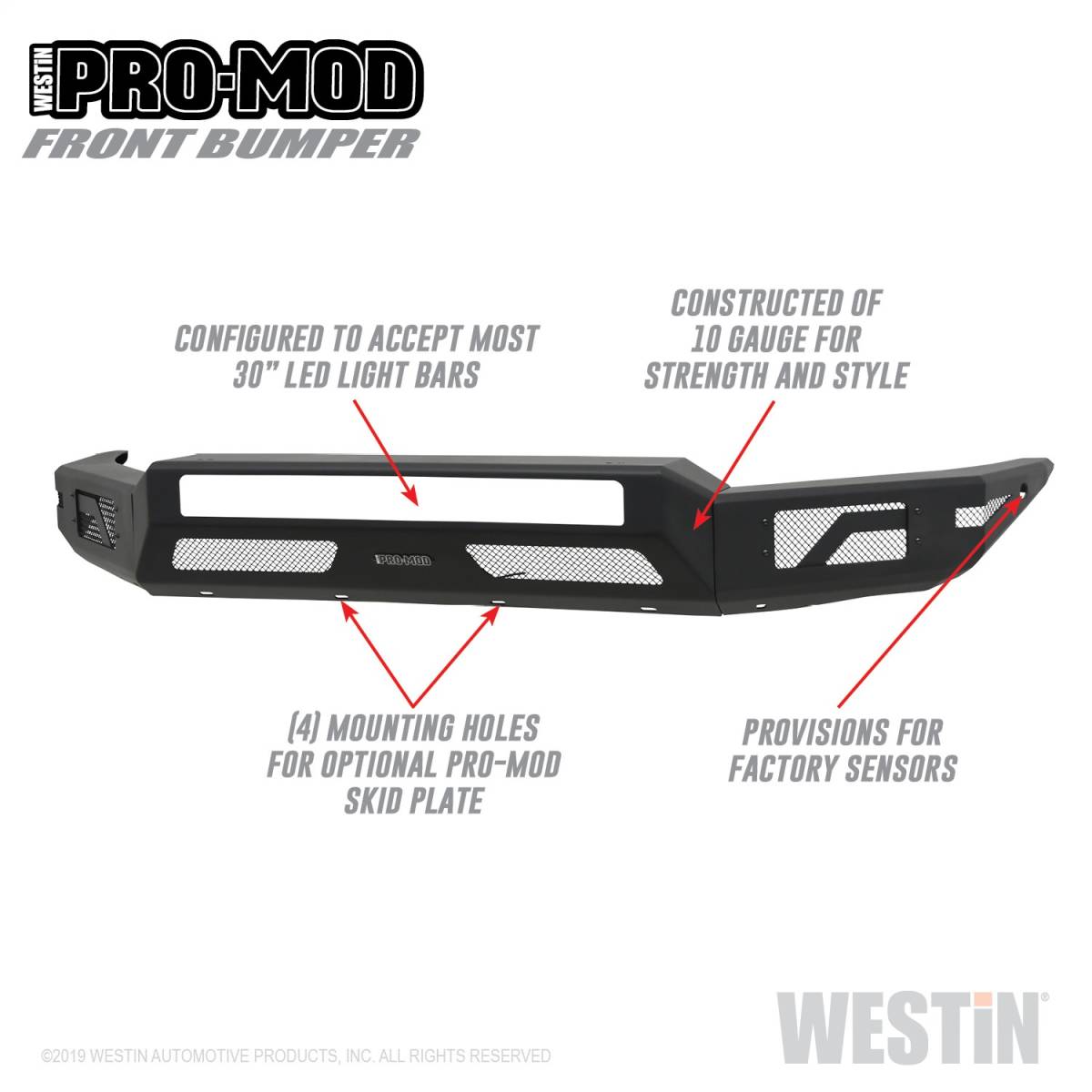 Westins Pro-Mod Front Bumper combines enhanced vehicle protection, with great looks. Pro-Mods revolutionary lightweight modular design is uniquely engineered with outrigger reinforcement brackets to provide maximum front end protection without compromising on strength, integrity or durability. The "high and tight" bumper profile creates a greater approach angle, which significantly improves off-road driving capabilities. The lightweight design also requires smaller shipping packages which dramatically reduces shipping costs. Pro-Mod bumpers feature a textured black finish with an e-coated base coat, providing long lasting corrosion protection from the elements. Once you see the Pro-Mod Front Bumper, the choice becomes obvious.