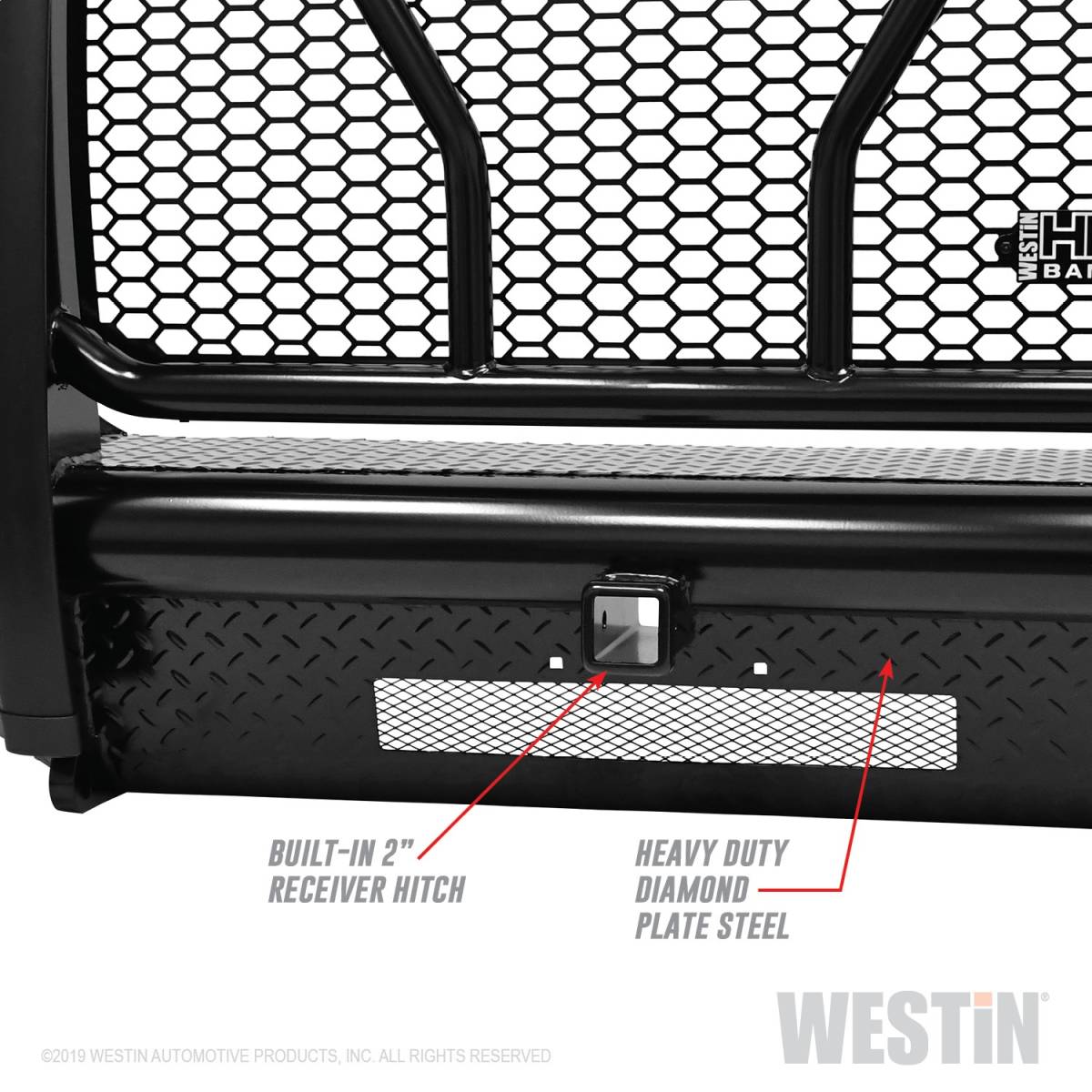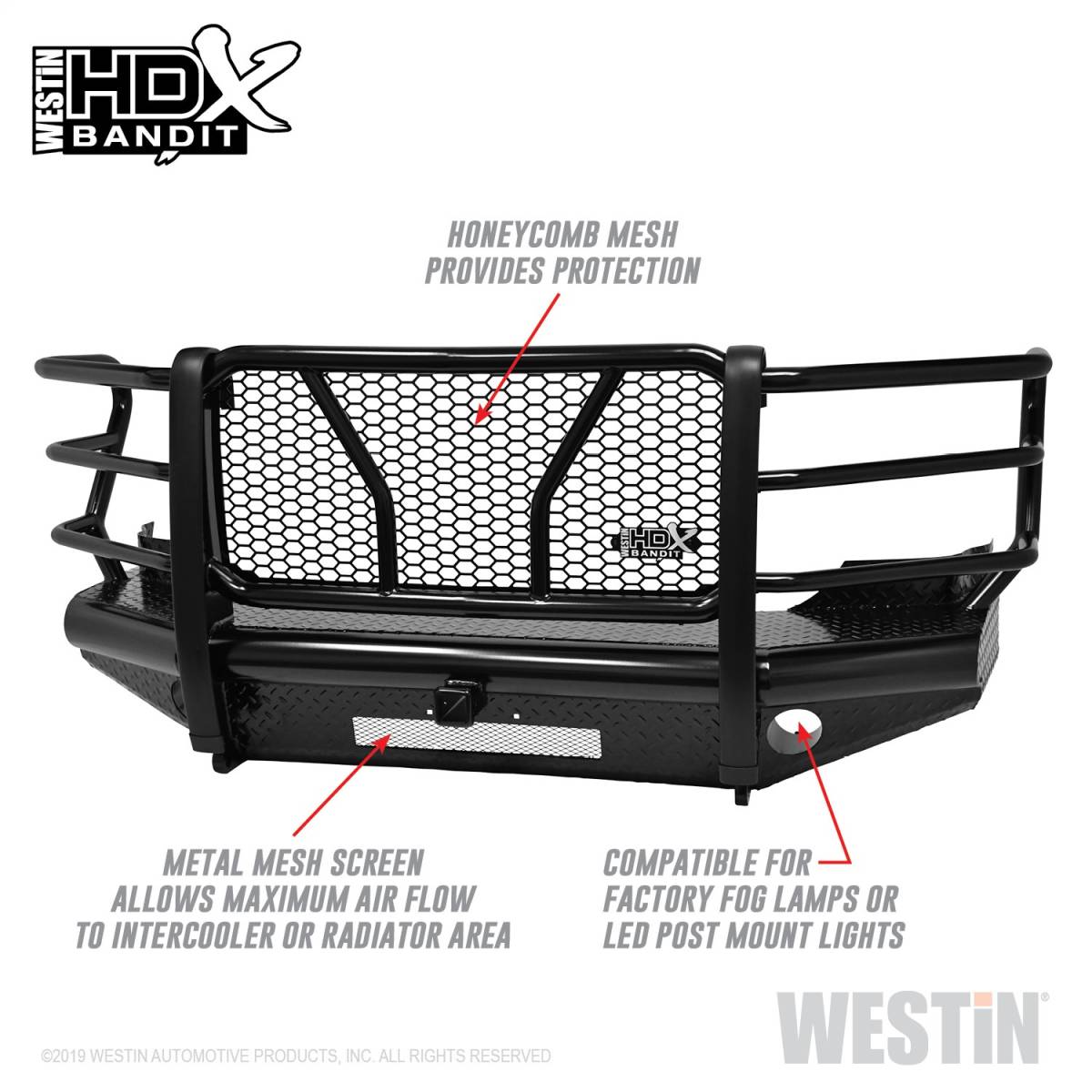 Westins HDX Bandit Bumper combines a heavy duty diamond plate steel bumper constructed of schedule 40 steel pipe with a stylish grille guard featuring 2" diameter outer wraparound wings and 2 3/4" wide upright rubber strips. Designed to protect headlights, grille, hood and front fenders from road hazards, debris and wildlife damage. Features a stylish metal honeycomb mesh screen, which allows maximum airflow to the intercooler or radiator area while accenting the front end styling with a clean and rugged look. Removable mesh screens allow for factory camera and adaptive cruise control options available on some late model Ford applications. HDX Bandit Bumper includes a built-in 2" receiver hitch and (2) heavy duty 9,500 lbs bow shackle mounts, capable of delivering multiple towing options. Compatible for factory fog lamps or LED post mount lights. In addition, some late model Ram and Chevrolet applications feature provisions for factory parking sensors. Bolt-on installation with hardware and mounting brackets included. Available in black powder coat finish.