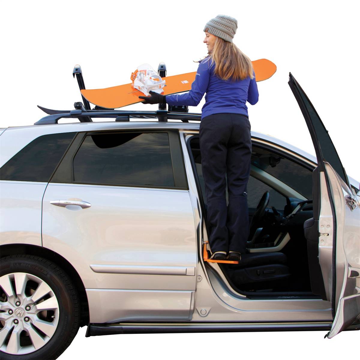The Rightline Gear Moki Door Step provides easy access to your vehicle's roof. Simply hook the Door Step over the u-shaped door latch in each of your vehicle's doors. The Step is used to load and strap down car top cargo bags and boxes; canoes, kayaks, and SUPs; skis and snowboards; and bikes. Even use it to help wash your vehicle's roof. The Step provides a comfortable platform for both feet and allows for a balanced standing position. The patented Step eliminates dirty shoes on vehicle seats and the need for step stools or ladders. If you are short or your vehicle is tall; the Moki Door Step makes getting your gear on or off your roof a breeze!