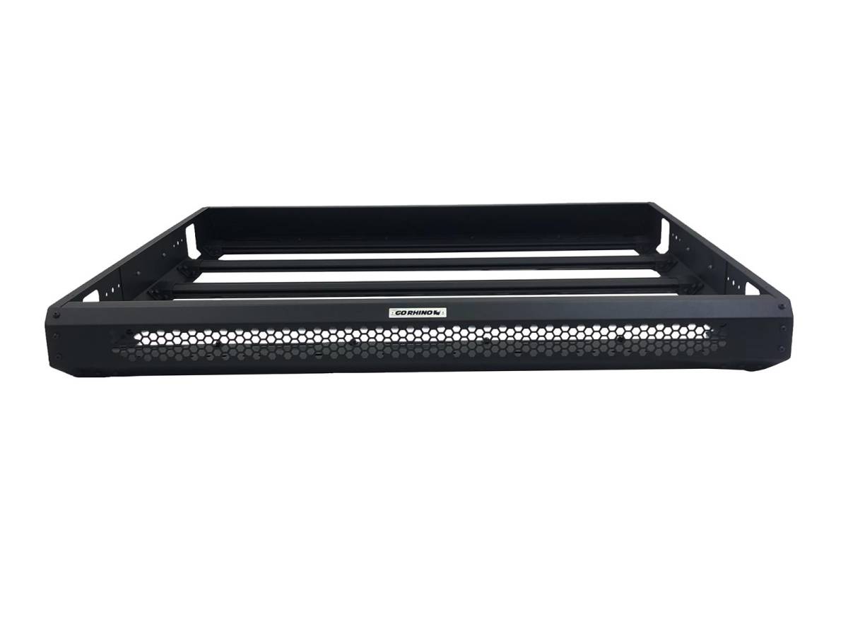 The Go Rhino SRM400 Roof Rack is a basket-style roof rack with removable front and rear fairings, which allow it to be customized to fit oversized items, such as lumber, kayaks or surfboards. It is equipped with Go Rhino’s exclusive 4-CORE aluminum bars, the extruded track system that works with any 1/4x20 hex bolt and provides unlimited mounting options for gear and trail tools. Integrated side light mounts and hole patterns offer a variety of supplemental lighting options. The SRM400 is 52 inches wide, 68 inches front-to-back, and can be mounted on any vehicle’s OE crossbars with the included Rhino Clamp system. Other mounting options are also available. SRM 400 come with a Limited Lifetime warranty on materials and construction and a 5 year warranty on the Textured Black Finish.