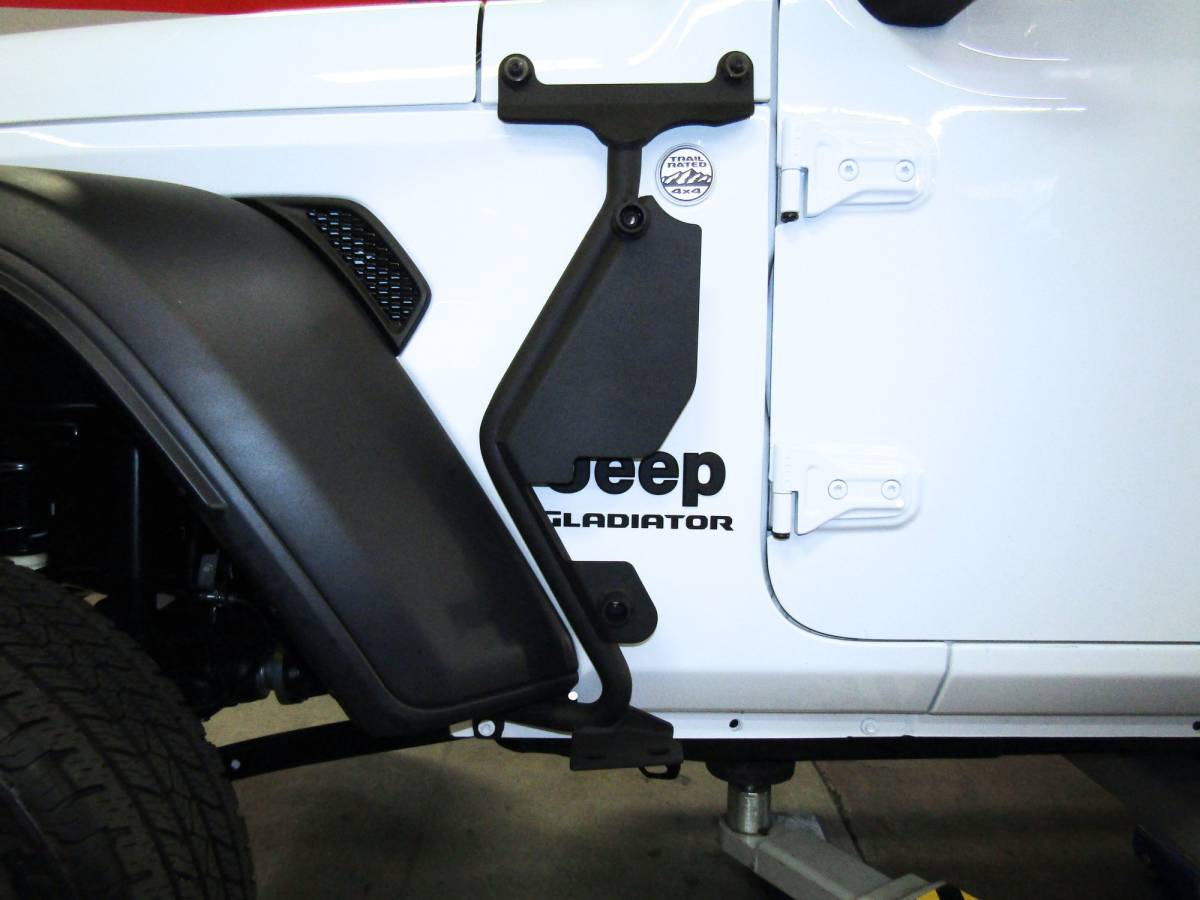 Front driver side exterior jack mount for Jeep Wrangler JL, JLU and GLADIATOR JT-mounts high clearance off-road and farm jacks securely to side of vehicle. Unique design keeps jack from rattling while driving. Easy no drill installation. The Jack Mount comes with a Limited Lifetime warranty on materials and construction and a 5 year warranty on the the textured black finish.
