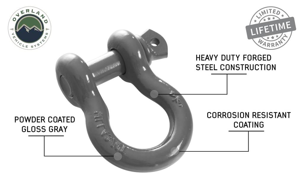Overland Vehicle System 3/4 Recovery Shackle in Gray is heavy duty forged D ring style shackle. Each OVS shackle has a two stage powder coat.