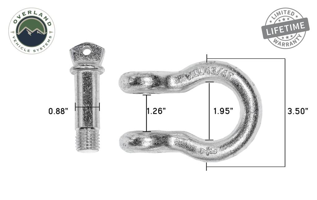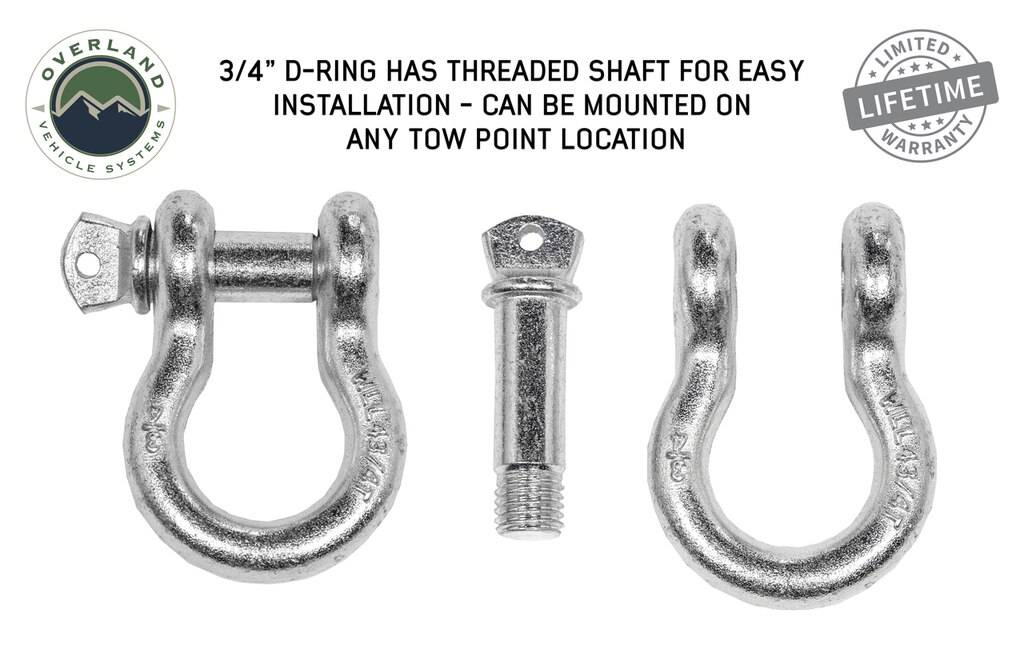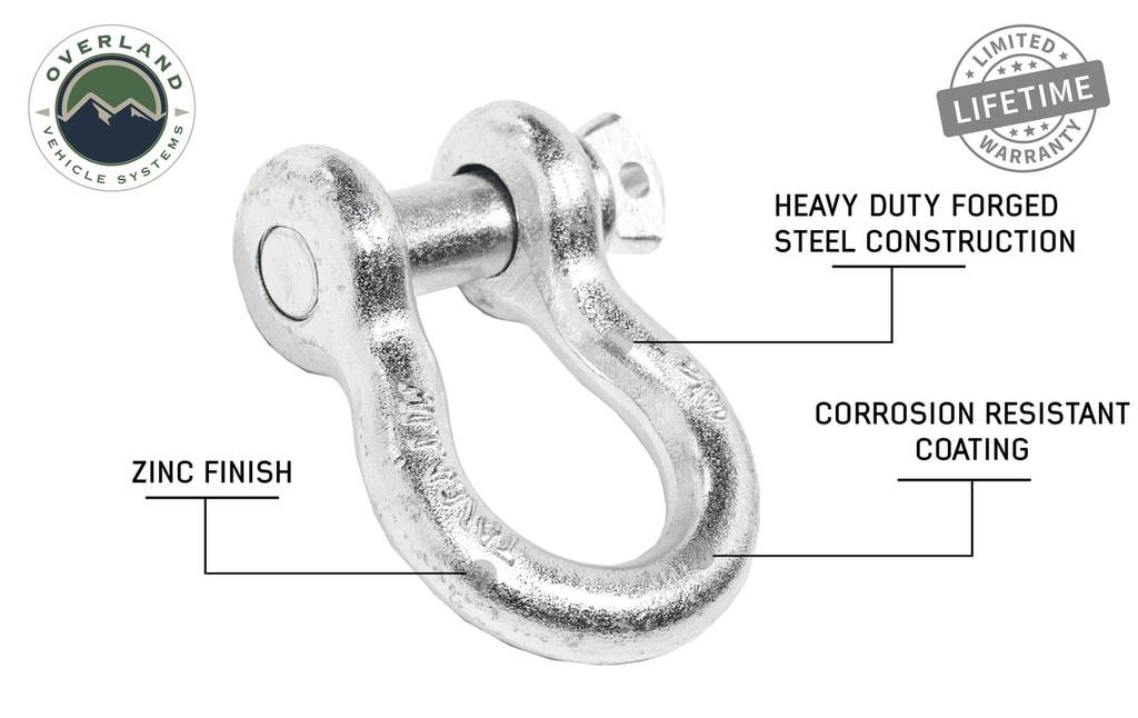Overland Vehicle System 3/4 Recovery Shackle in Zinc is heavy duty forged D ring style shackle. Each OVS shackle has a two stage powder coat.