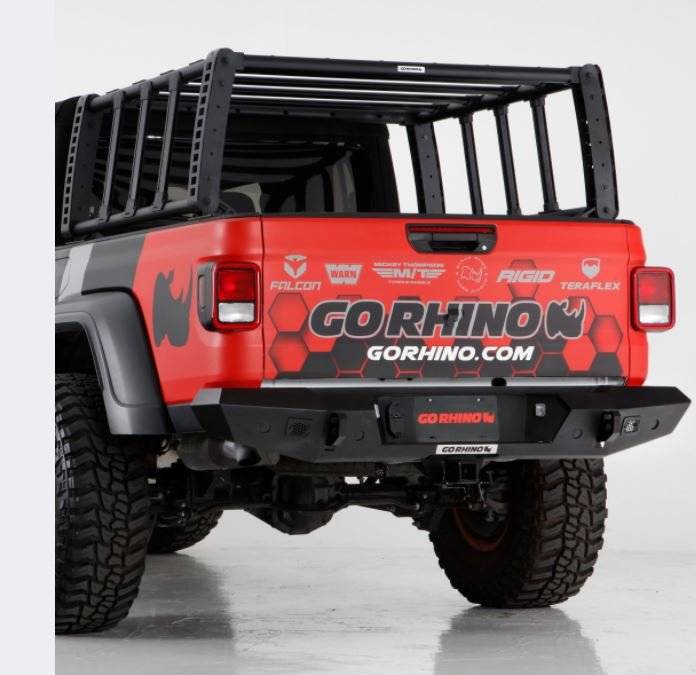 Part of Go Rhino's famous Jeep Bumper family of products. Go Rhino’s Trailline® Full Width Rear Bumper for Jeeps complements the Trailline front bumper with the same care for fit, function and style. The shell is CNC laser cut and formed 3/16” thick steel with fully welded, hand finished seams and has provisions for the installation of two additional compatible flush-mount lights. Patented Rhino Horn shackle mounts can fit 7/8” D-rings. Installation is easy with no drilling or cutting required. The Trailline rear bumper is compatible with the factory hitch. The Trailline rear bumper is compatible with the factory hitch. Trailline Bumpers come with a Limited Lifetime warranty on materials and construction and a 5 year warranty on the Textured Black Finish.
