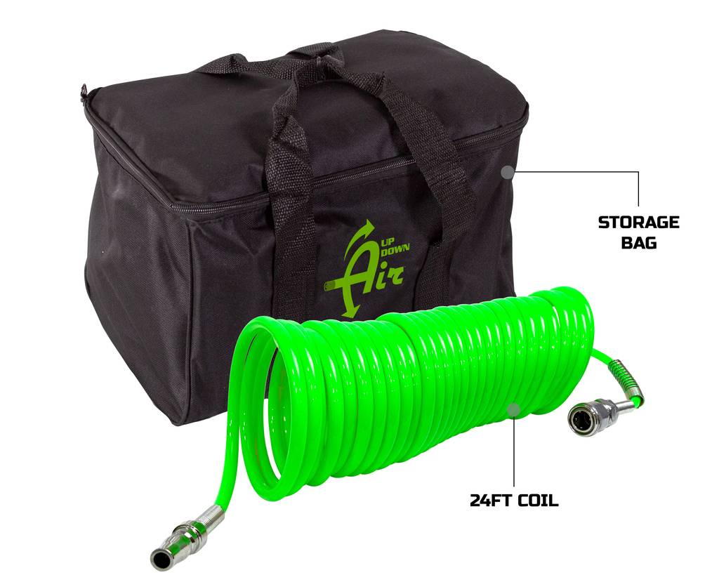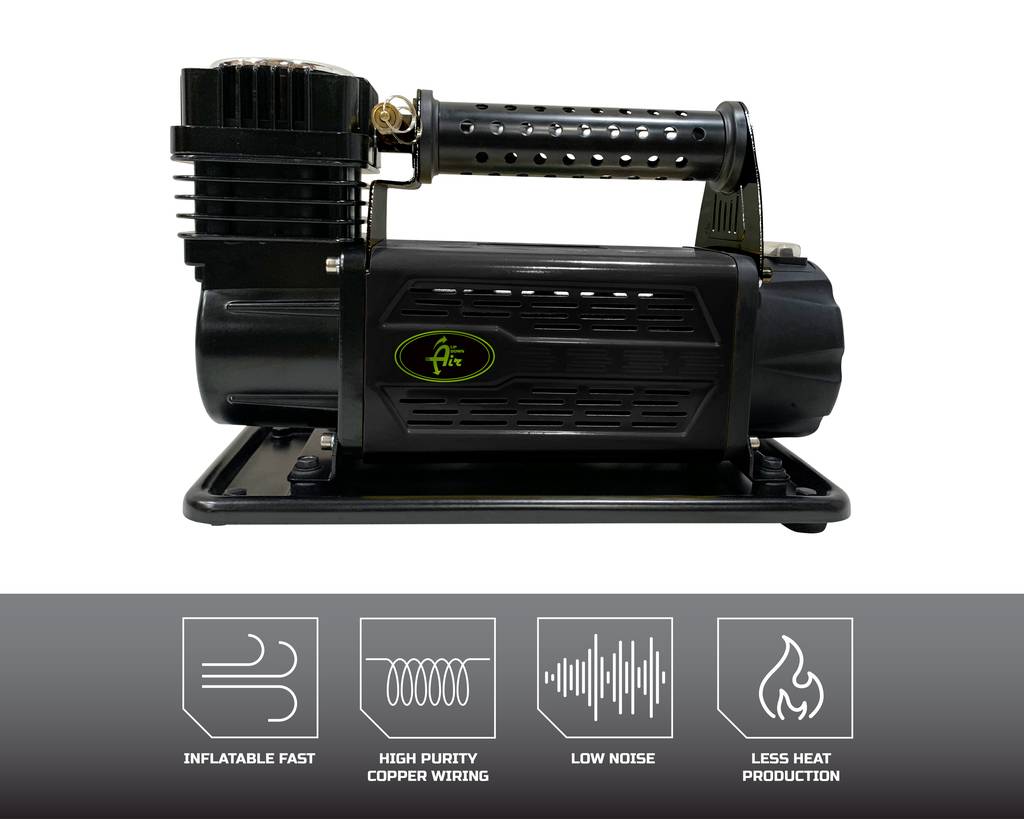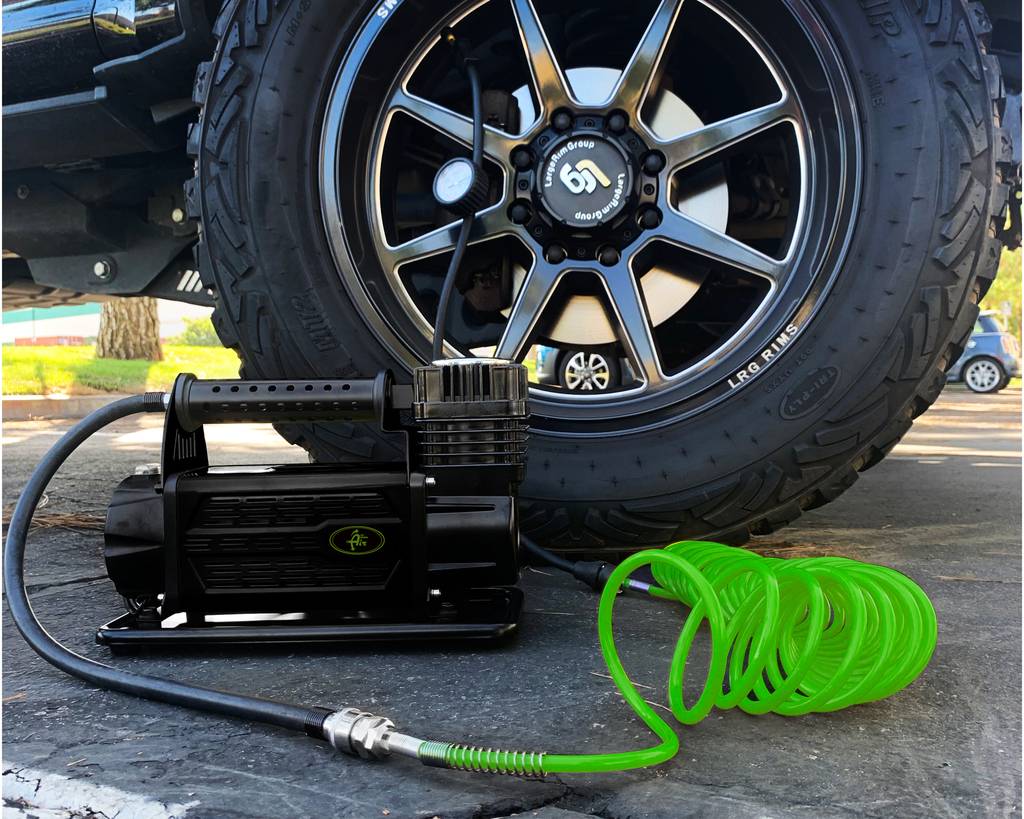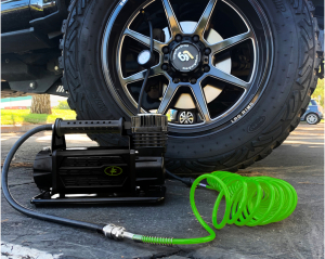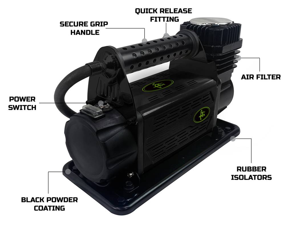 Features: 1/3 Horsepower Motor putting out 5.6 CFM with a thermal cutoff switch, 120V heavy-duty battery leads with Alligator clips make connection quick and easy, 150 PSI maximum output with 120 PSI working pressure, 75% duty cycle, 24' coiled air hose with integrated pressure gauge and quick connect fittings, portable design with nylon storage bag and handle What's Included: Heavy duty Compressor, coiled hose, quick connect fittings, alligator clips, storage bag with handle. Application: over-sized off-road tires, tractor tires, and trailer tires – heavy duty application which can handle Tire PSI requirements from 0 to 110 PSI Vehicle Requirements: any vehicle with a 12-volt battery The EGOI high-performance air compressor puts out 5.6 CFM, one of the most powerful portable systems today. The output this system puts out can handle the smallest jobs to the biggest with no problem. The sheer volume of air that this system puts out makes tire inflation quick and easy. Designed for the off-roader in mind, this system can work on bikes, boats, trailers, and RV tires as well. Features: Maximum Air Flow 5.6 CFM Maximum Air Pressure 150 PSI Maximum Voltage 13.8 Maximum AMP draw 45 Maximum 8' 120V heavy-duty power cables with alligator clips that allow connecting directly to the battery easy and quick This workhorse features a 1/3 horsepower motor makes this one of the largest motors in the portable class Built-in Thermal cut off switch make sure your system doesn't overheat and protects your investment 24' coiled hose with pressure gauge and quick release fittings make this unit easy to use and stow It fits nicely in our ballistic nylon bag with caring handles Capable of handle the smallest to the largest jobs