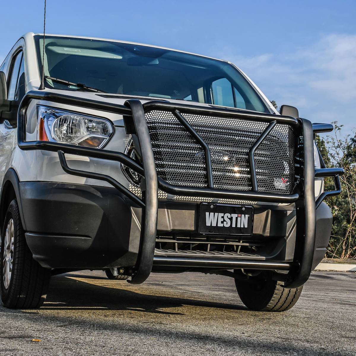 The distinctive HDX Grille Guard from Westin provides the ultimate in front end protection, for all 2015-2021 Ford Transit Vans. It's engineered as a fully welded 1-piece grille guard which features full wraparound wings made of heavy duty 2" diameter tubing. Uprights are finished and protected with extra wide rubber strip that is 1/8" thick and 2 3/4" wide resulting in a solid clean look and added impact protection. The full punch plate grille protects the vehicles entire grille area. The HDX Grille Guard is available in black powder coat finish.