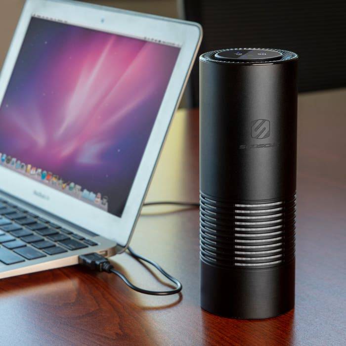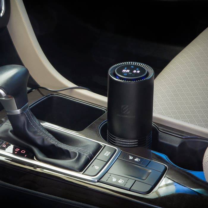 Portable HEPA Air Purifier/Deodorizer designed to fit in the cup holder of your vehicle to make your drive more comfortable and healthier. Motion-activated with two fan speeds, you can plug it in and forget it as it purifies and deodorizes the air. If you suffer from allergies to pollen, dust, pets, or smoke, this is a must-have accessory.