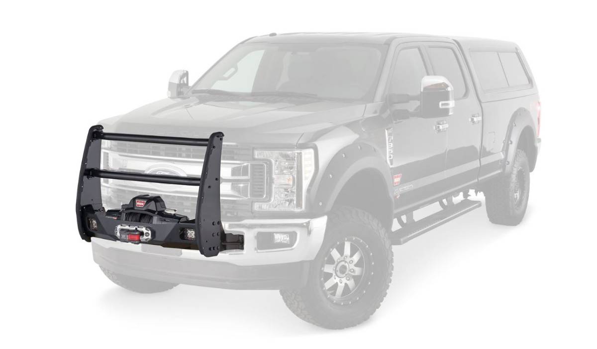 Powder Coated; Black; With Brush Guards; 2 Inch Diameter Cross Bars With Tabs To Mount Lights; Without Skid Plate; Without Step Plate. Requires Winch Mount