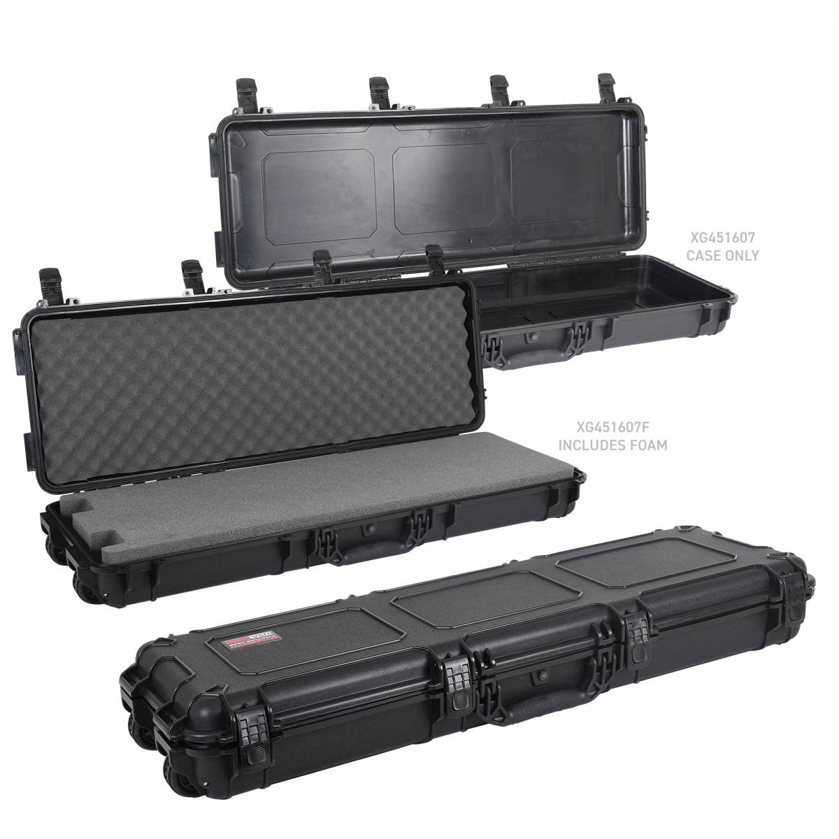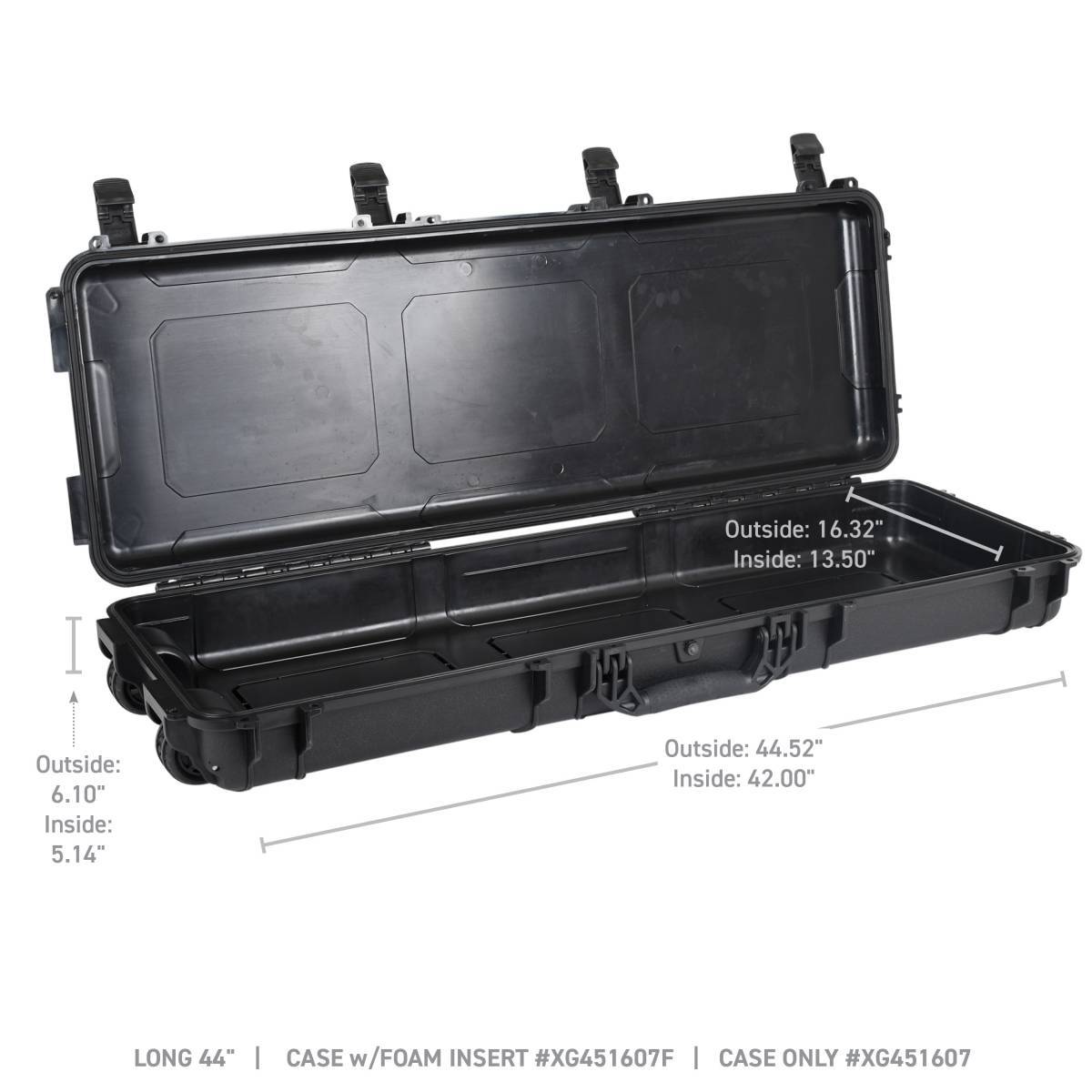 Protects your valuables and gear from dust, dirt and moisture; Provision to add locks for security purposes; Steel pin hinges add strength and durability; Stackable design with exterior grooves for additional cases to snap into place; Foam not included; Limited Lifetime Warranty; Made in the U.S.A.; O.D. Large Size: 44.52" x 16.32" x 6.10"; I.D. Large Size: 42" x 13.50" x 5.14"; Injection molded from high impact, tough, light-weight polypropylene copolymer (PPC); Virtually indestructible and UV-safe for years of outdoor use; Patented, family-friendly finger-safe flex latches; Rubberized handles with softer grip for comfort; Automatic air valve releases pressure for airline transport; IP67-rated dustproof and waterproof with airtight rubber gasket seal