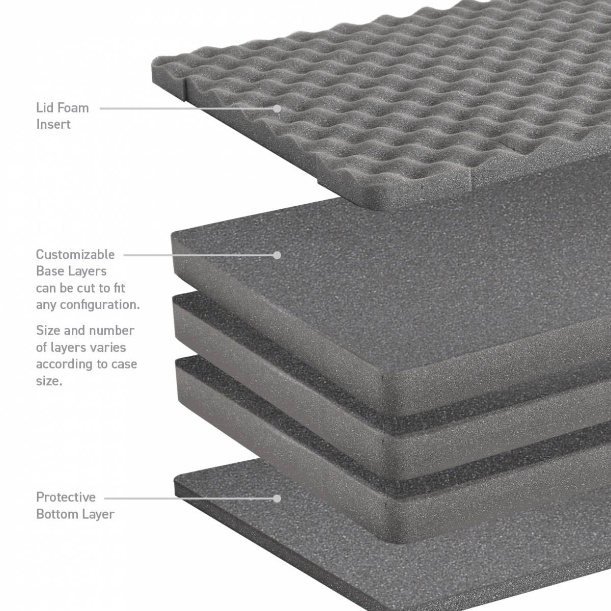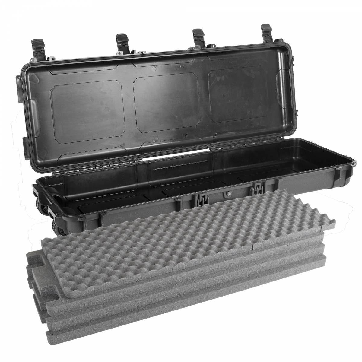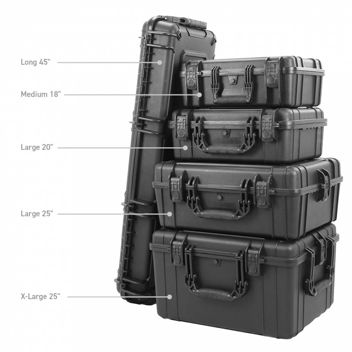 Foam included made in Mexico; IP67-rated dustproof and waterproof with airtight rubber gasket seal; Provision to add locks for security purposes; Steel pin hinges add strength and durability; Stackable design with exterior grooves for additional cases to snap into place; Limited Lifetime Warranty; Boxes made in the U.S.A.; Protects your valuables and gear from dust, dirt and moisture; O.D. Large Size: 44.52" x 16.32" x 6.10"; I.D. Large Size: 42" x 13.50" x 5.14"; Injection molded from high impact, tough, light-weight polypropylene copolymer (PPC); Virtually indestructible and UV-safe for years of outdoor use; Patented, family-friendly finger-safe flex latches; Rubberized handles with softer grip for comfort; Automatic air valve releases pressure for airline transport