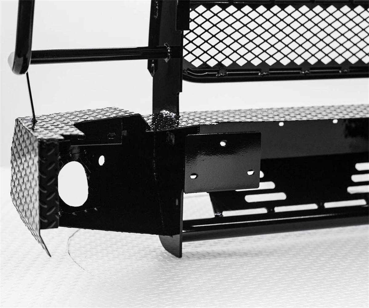 The Summit Series Front Bumper Replacement still provides superior protection similar to the Legend while offering an alternative style with reduced weight. This bumper is designed and ideal for half ton trucks. It is frame-mounted and is one-piece fully welded construction. The main body of the bumper is manufactured from diamond plate steel and the grille guard portion provides wraparound headlight protection. The punched plate grille insert is specifically designed to match the make and model of the vehicle – no expanded metal used. Most pre-2014 Summit Series Replacement Bumpers allow for the optional patented H2R (Hidden 2 in. Receiver). In some applications, factory fog lights and tow hooks can be retained.
