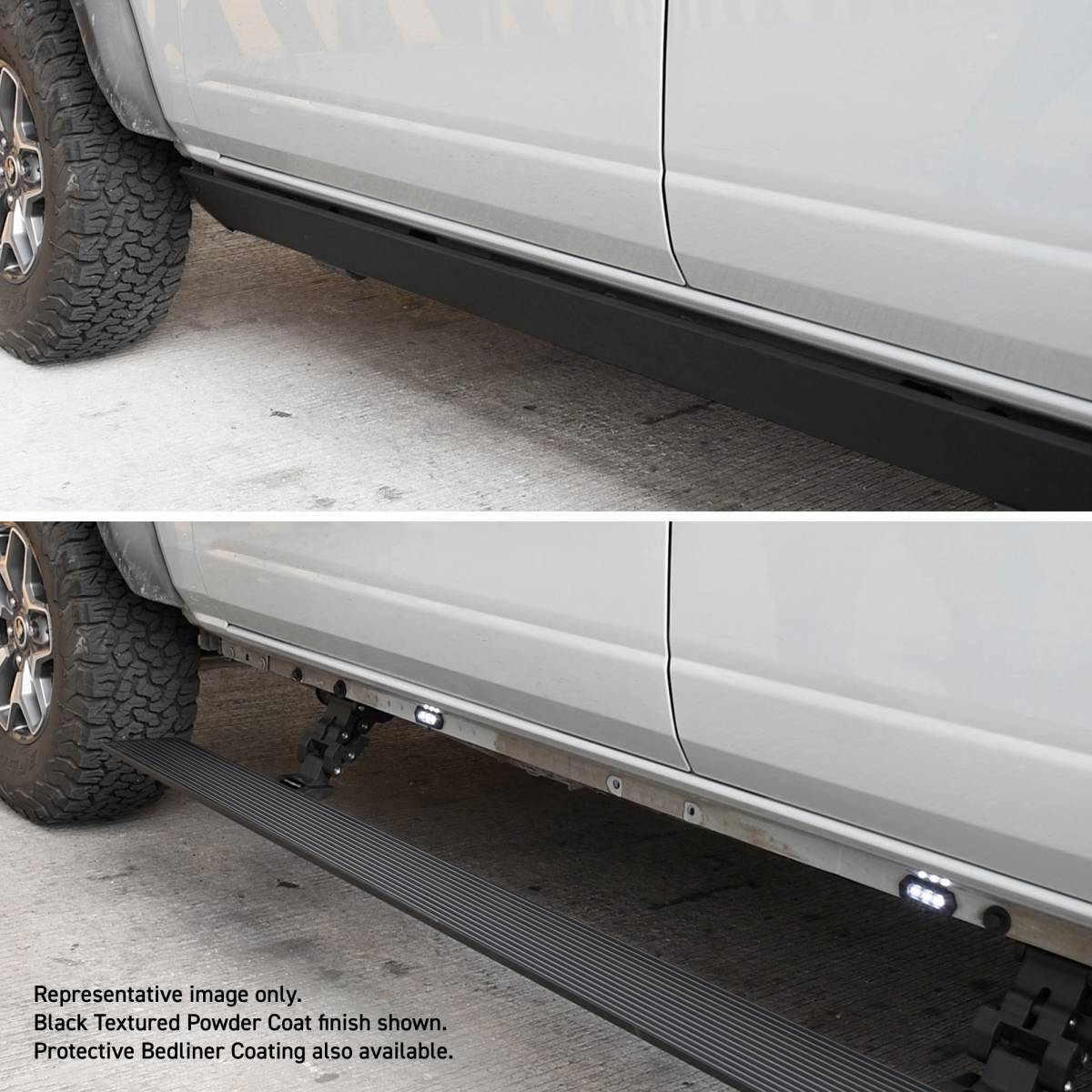 Go Rhino’s E1 Electric Running Boards allow you to step in and out of your truck, Jeep, Bronco or SUV with ease. Open your door and the E1 automatically deploys, providing a secure 6” wide durable aluminum running board with an anti-slip surface. For additional safety and security, the integrated LED lights turn on automatically when the board deploys. Close your door and E1 automatically retracts, providing your vehicle with optimal ground clearance and protection for its rocker panel while preserving the look of your vehicle. With dual motors on each board, Go Rhino's electric running boards are reliable even in extreme climates. The easy-to-install, magnetically-activated door switches leave your OBD port free for other accessories. Automatic safety stop and manual override capabilities are included. Boards are finished with a Bedliner Coating and have black nylon endcaps. The E1 Electric Running Board Kits come with a Limited Lifetime warranty on materials and construction and a 5 year warranty on the Bedliner finish.