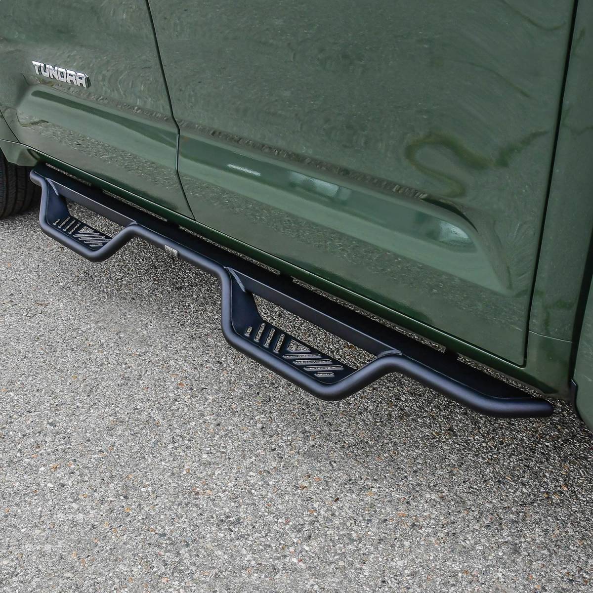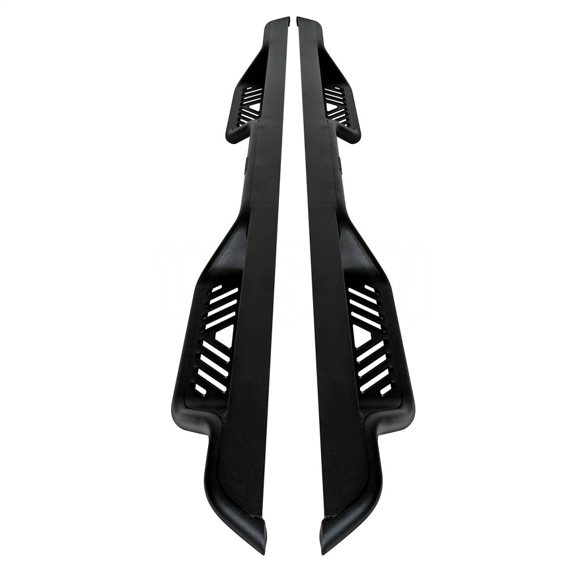 1.5 in. Diameter Mandrel Bent Steel Tube; Distinctive 4 in. Drop Die-Stamped Step Plate Provides Maximum Traction While Cleaning Dirt/Mud/And Debris; Bolt-On Installation - No Drilling Required; Hardware And Mounting Brackets Included; Electrostatic Base Coat Provides Long Lasting Corrosion Protection; Available In Textured Black Powder Coat Finish