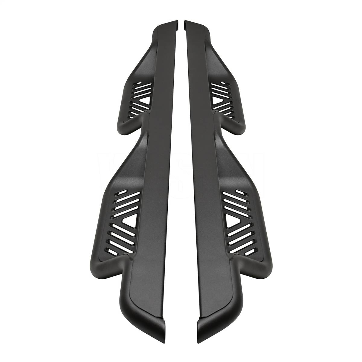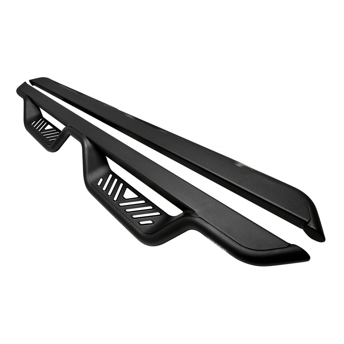 1.5 in. Diameter Mandrel Bent Steel Tube; Distinctive 4 in. Drop Die-Stamped Step Plate Provides Maximum Traction While Cleaning Dirt/Mud/And Debris; Bolt-On Installation - No Drilling Required; Hardware And Mounting Brackets Included; Electrostatic Base Coat Provides Long Lasting Corrosion Protection; Available In Textured Black Powder Coat Finish