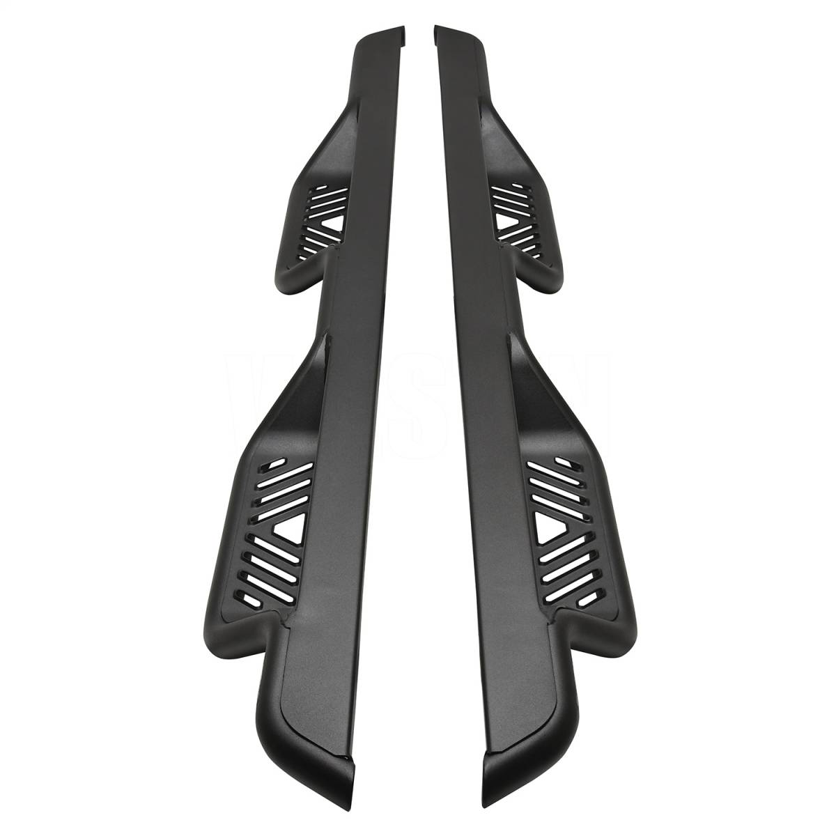 1.5 in. Diameter Mandrel Bent Steel Tube; Distinctive 4 in. Drop Die-Stamped Step Plate Provides Maximum Traction While Cleaning Dirt/Mud/And Debris; Bolt-On Installation - No Drilling Required; Hardware And Mounting Brackets Included; Electrostatic Base Coat Provides Long Lasting Corrosion Protection; Available In Textured Black Powder Coat Finish
