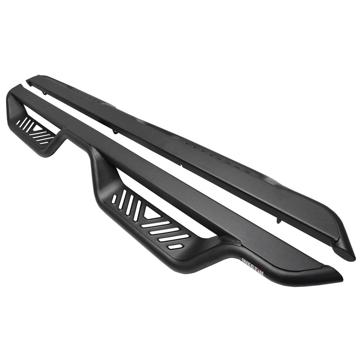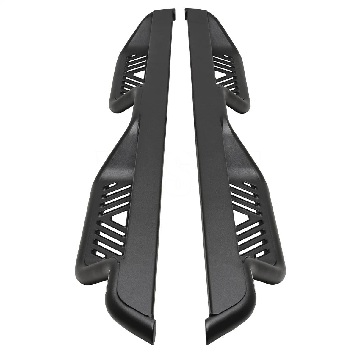1.5 in. Diameter Mandrel Bent Steel Tube; Distinctive 4 in. Drop Die-Stamped Step Plate Provides Maximum Traction While Cleaning Dirt/Mud/And Debris; Bolt-On Installation - No Drilling Required; Hardware And Mounting Brackets Included; Electrostatic Base Coat Provides Long Lasting Corrosion Protection; Available In Textured Black Powder Coat Finish