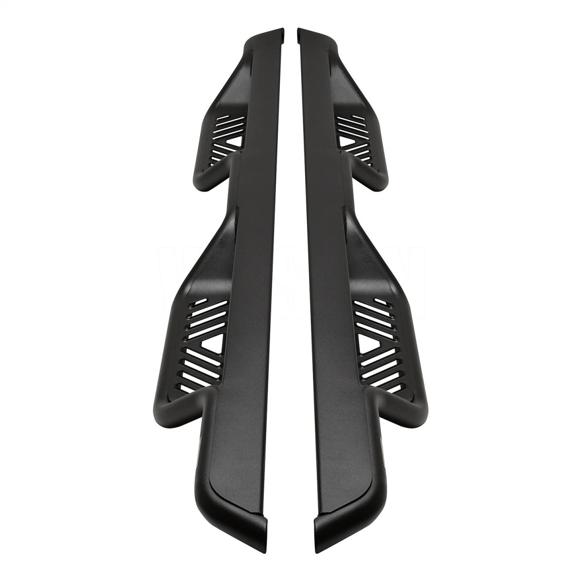 1.5 in. Diameter Mandrel Bent Steel Tube; Distinctive 4 in. Drop Die-Stamped Step Plate Provides Maximum Traction While Cleaning Dirt/Mud/And Debris; Bolt-On Installation - No Drilling Required; Hardware And Mounting Brackets Included; Electrostatic Base Coat Provides Long Lasting Corrosion Protection; Available In Textured Black Powder Coat Finish