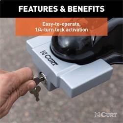 Make your tow vehicle and trailer more secure by keeping them locked up tight with a CURT hitch and coupler lock set. This three-piece set includes a hitch lock, coupler lock and trailer coupler lock, so whether you are towing or storing, you can keep your trailer more secure. Like a hitch pin and clip, the hitch lock is designed to insert into the hole in the side of a receiver tube to hold a ball mount or hitch-mounted accessory in place. It features a pin diameter of 5/8 in. to fit 2 in. receiver tube openings. Likewise, CURT coupler locks are designed to add security to your trailer and towing equipment. Instead of merely retaining the coupler latch mechanism, they lock it into place and act as a theft deterrent for your trailer while it is coupled to your vehicle. This coupler lock features a pin diameter of 1/4 in. and fits any coupler span from 1/2 in. to 2-1/2 in.. This set of three locks also includes a trailer coupler lock to deter theft of your trailer while it is parked and left unattended. The lock mounts over the coupler and prevents a trailer ball from being inserted into the coupler opening. This trailer coupler lock is able to fit 2 in. and 2-5/16 in. flat lip couplers. It is constructed from lightweight, rust-free aluminum and has an anodized aluminum finish. For the ultimate in towing security, a hitch lock and coupler lock used together will provide security at both the vehicle side and trailer side of your towing setup. Also for added convenience, all three locks in this lock set are keyed alike. For your boat, ATV or camper, keep your toys more secure with CURT locks.