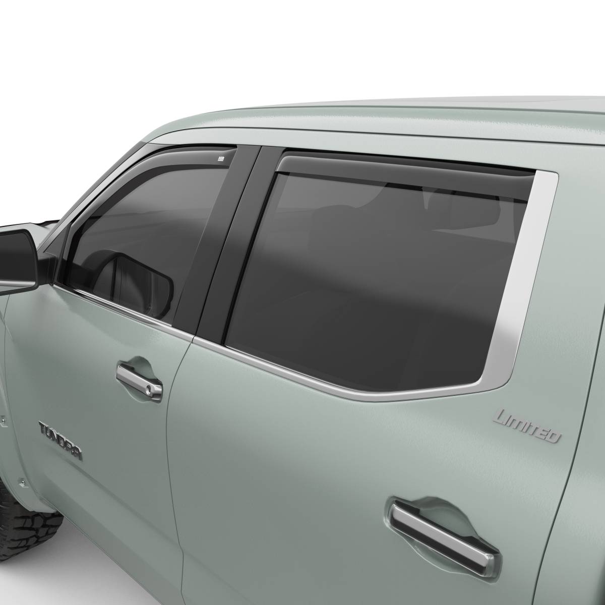 EGR DARK SMOKE In-Channel Window Visors are designed to promote fresh air circulation inside the vehicle. These fully integrated, custom molded designs help to reduce windshield fogging in wet weather for safer driving, and can lower interior temperatures in parked vehicles. The UV protected finish is easy to clean.. Limited lifetime warranty. FRONT & REAR SET.