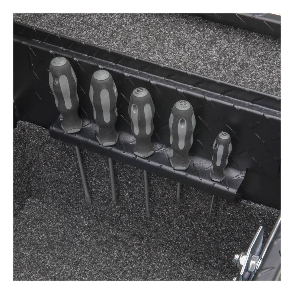 UWS Secure Lock crossover truck tool boxes provide the ultimate in security and convenience, offering you a truck bed tool box unlike any other. It features a unique locking system, an innovative interior and a highly durable design. The Secure Lock truck box operates with two lockable twist handles. These handles are key-operated and allow you to lock the truck tool box from either the driver or passenger side. The two locks also give you the option to lock both sides for maximum security. The lid of the Secure Lock tool box is particularly strong, featuring our RigidCore foam-filled design. This gives the lid greater structural integrity and resists bending and warping. Like most UWS tool boxes, this box also features extra-thick aluminum construction, and the tub is welded into a single piece to ensure waterproof protection for your items. It is also equipped with a MicroSeal gasket to keep out dust, grime, moisture and insects. To protect the interior of the Secure Lock tool box, it features a heavy-duty BedRug liner. This protective mat resists dents and damage to the box itself and to your tools and other items, and it helps trap dust and dirt for easy cleanup. The UWS Secure Lock truck tool box offers excellent organization for your tools, featuring an included three-compartment tray and built-in screwdriver holders. The lid is able to open to a complete 90 degrees for easy access to the interior contents, and it is equipped with self-closing struts that automatically close the lid with a slight manual pull, securing the box when your hands are full. The Secure Lock truck tool box is quick and easy to install, and it is available in multiple sizes to provide the perfect fit for your own unique truck bed.