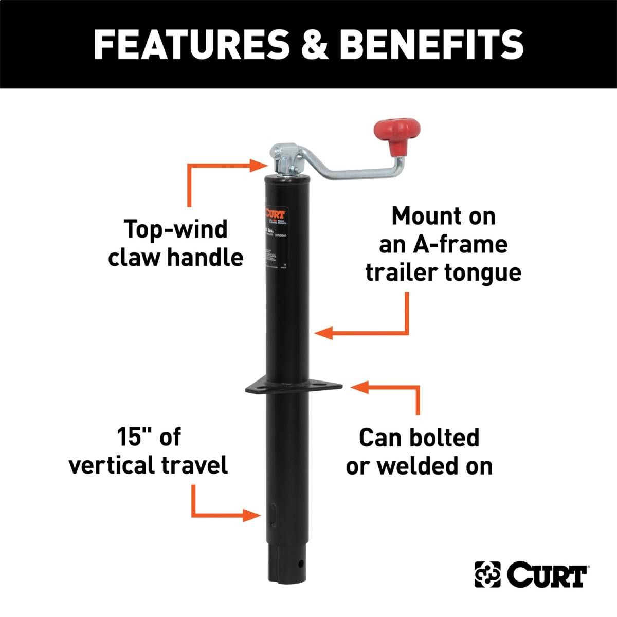 In our goal of being your best source for all things towing, the CURT line of trailer jacks is designed with care and manufactured with pride. CURT jacks are made with quality to promote the life and function of your trailer, and they come in several different styles to accommodate your needs, whether you are a frequenter of the boat landing, the campground, the racetrack or the field. CURT A-frame jacks are designed specifically for A-frame trailers. They can be bolted or welded directly onto the trailer frame. Though they are not able to swing up and out of the way like CURT swivel jacks, A-frame jacks are made to retract completely to ensure enough clearance for safe travel. This CURT A-frame trailer jack features a weight capacity of 5,000 lbs., a travel of 15" and a top-wind handle. It does not matter what kind of trailer you tow -- a boat trailer, utility trailer, livestock hauler or recreational vehicle trailer -- if you have a receiver-style trailer, you will want a jack that complements its function. For a trailer jack that will not steer you wrong, CURT has the answer.
