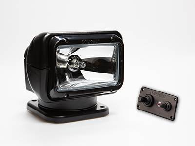 Permanent Halogen Spotlight with Wired Dash Mount Remote.12V, 5.5 AMP, 65W. Package includes Light, Rockguard, Gasket, Caps, Screws, Wired Dash Remote, 20 Ft Wiring Harness