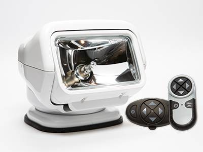 Permanent Halogen Spotlight with Wireless Hand Held & Wireless Dash Mount Remote.12V, 5.5 AMP, 65W. Package includes Light, Stainless Steel Mounting Plate, Wireless Hand Held Remote, Wireless Dash Mount Remote, Rockguard, Mounting Plate Screws, Cord Grommet