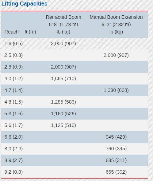 Electric Crane with a 6,000 ft lb (0.8 ton-m) moment rating and a maximum lifting capacity of 2,000 lb (907 kg) at 3 ft (0.9 m), Manual boom extends from 5' 8" (1.73 m) to 9' 3" ft. (2.82 m), and 360 Degrees continuous manual rotation with manual brake)