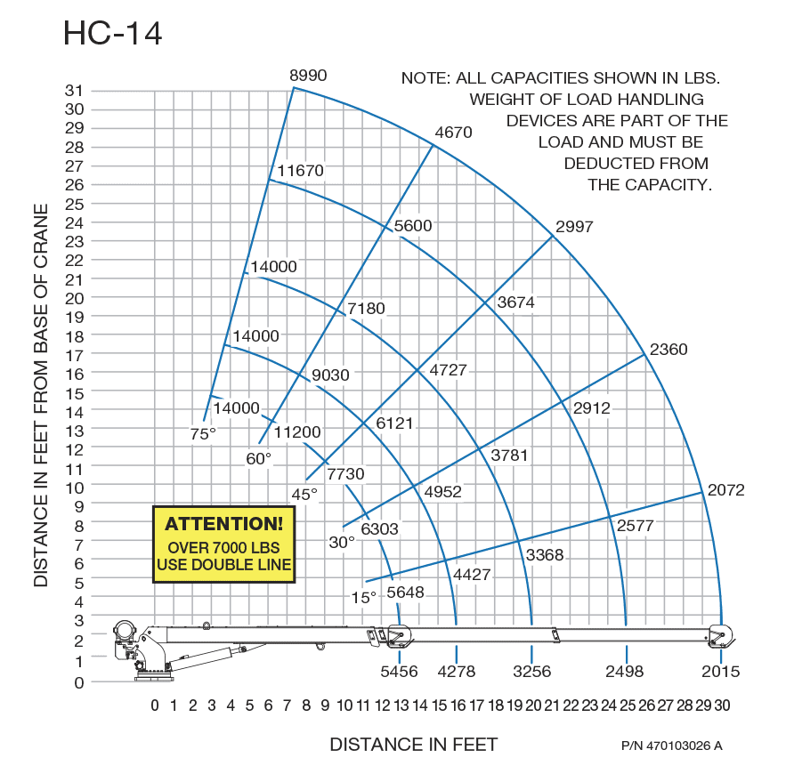 Hydraulic Crane with a 70,000 ft lb (9.68 tM) moment rating and a maximum lifting capacity of 14,000 lb (5,443 kg) at 6 ft. (1.83 m)