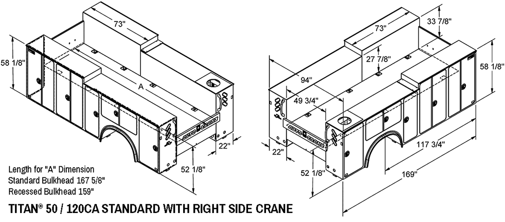 - Options- Manual or hydraulic outriggers. 24" (610 mm) workbench storage bumper. Receiver hitch. Rope and dome lights for compartments. Flood lights. Crane boom support. Individual drawer units. Drop-well for front compartment. Slide-out tool tray. Adjustable shelving. Lockable sliding tops. Master locking system. Oxy/acetylene bottle holder