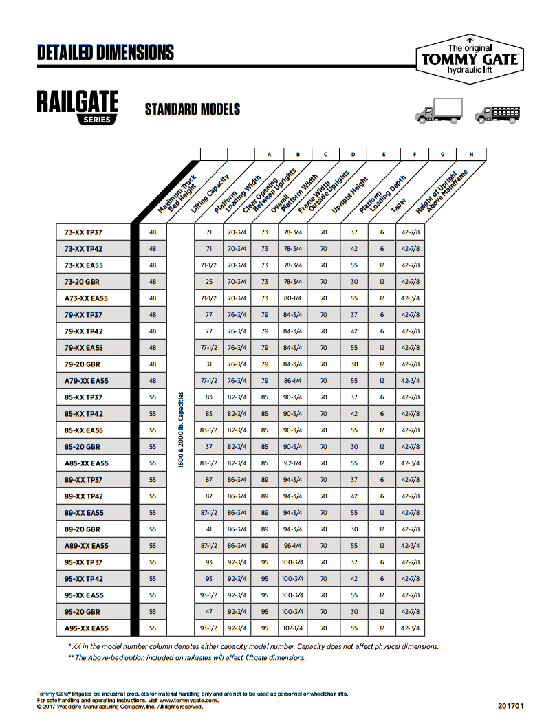 - 1616 and 2000 lb. capacity railgates come standard with safety trip bar, auto close, and recessed lights.