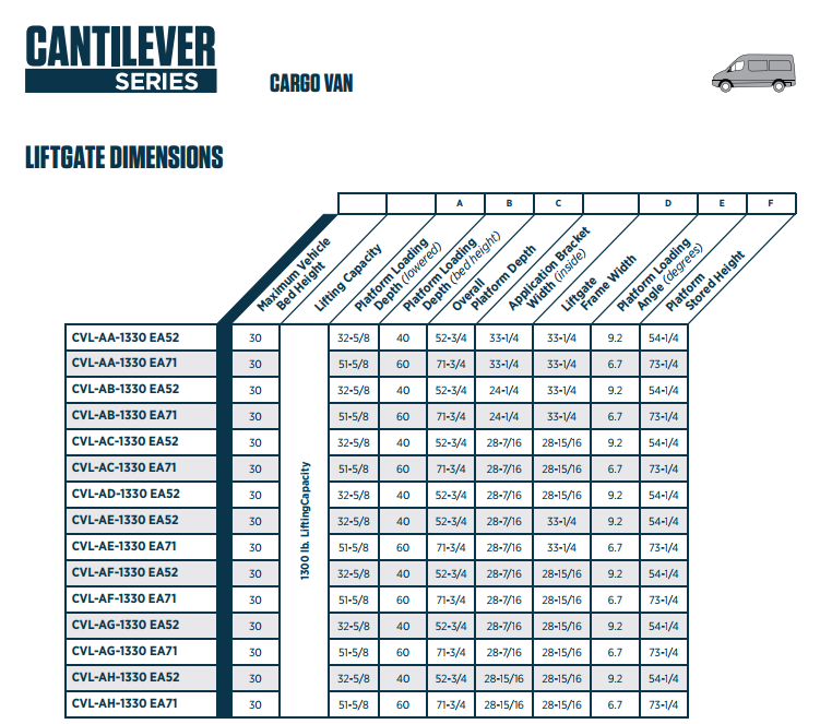 The culmination of years of engineering, Cantilever Series models are highly versatile and include numerous desirable features. A bolt-on underside mount is compatible with most modern vans and eliminates the need for any welding. The platform is constructed from corrosion-resistant aluminum and folds laterally, allowing for access to the rear of the vehicle without operating the lift.