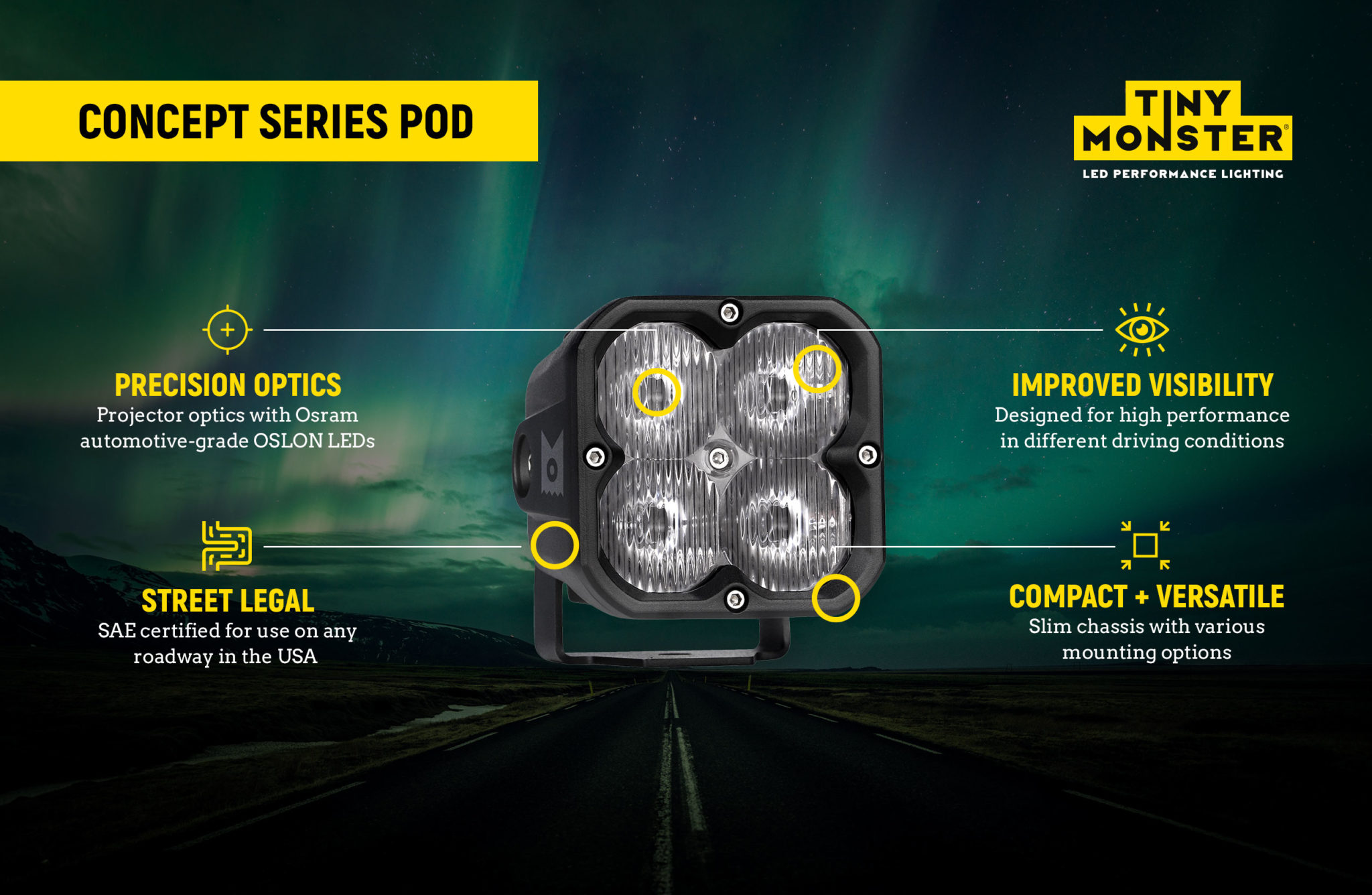 The Tiny Monster Concept Series LED Pods are a great option for anyone looking for an LED lighting solution that is compact and versatile enough to be mounted anywhere on a vehicle.