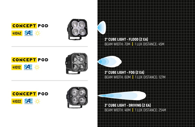 The Concept Series pods are available in a variety of beam patterns including fog, flood,